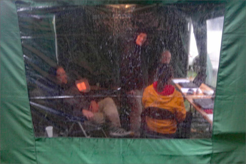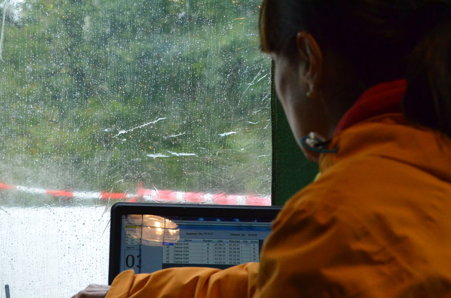 Heute der wichtigste Gegenstand im Zeitnehmerzelt: Man achte auf den orangen Fleck ein Stückchen links von der Bildmitte.