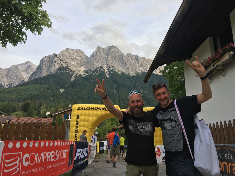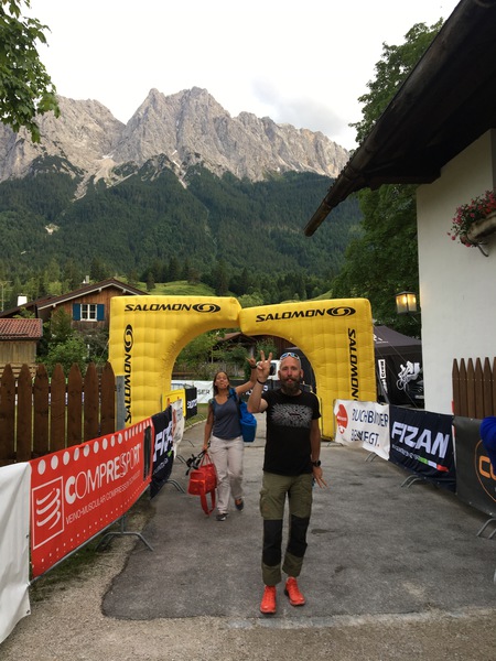 Zum Abschluss gibt’s noch ein paar Fotos am Start-und Zielbogen mit der, in der Abendsonne leuchtenden, Zugspitze im Hintergrund.