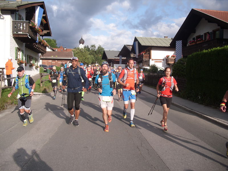 Wieder mit Julianes Golf zurück nach Grainau. Nach 15 Minuten Fahrt erreichen wir um 06:45 Uhr den Startbereich. Unterwegs ergibt sich noch die Möglichkeit, in der örtlichen Bäckerei in Grainau zwei Croissants, eins mit Schoko, eins mit Vanille, zu ergattern. Also doch noch Frühstück, hatte ich schon gar nicht mehr mit gerechnet. Aber leider ohne Kaffee, dafür reicht die Zeit dann doch nicht mehr. Die große Reisetasche muss auch noch im Kurhaus bei den netten Helfern deponiert werden. Auch das geht problemlos und Ruck-zuck. So schaffe ich es gerade noch rechtzeitig zur Gepäckkontrolle, wo ich die Pflichtausrüstung vorweisen muss. Als Pflichtausrüstung musste mitgeführt werden: Ein Laufrucksack mit Rettungsdecke und Erste-Hilfe-Set, Notfallpfeife, ausreichend Flüssigkeit, warme und regendichte Bekleidung, ein Mobiltelefon sowie eine Stirnlampe, da das Gros der Teilnehmer das Ziel in Grainau erst nach Einbruch der Dämmerung, im Dunkeln oder wie wir - am nächsten Morgen erreichen wird.