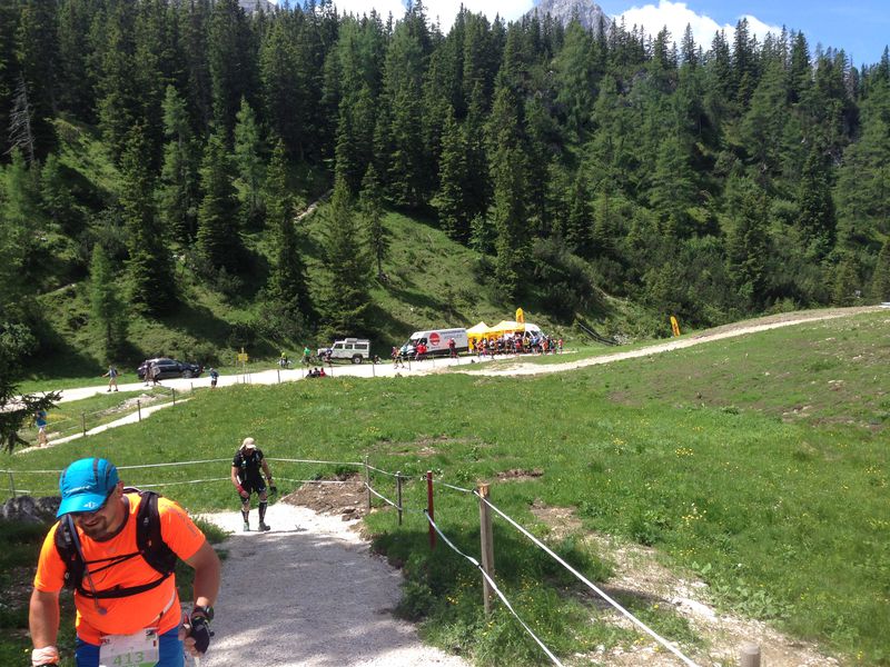 Die Gamsalm – VP2, 19,5 km + 1370 hm sind geschafft, laufe ich nach 03:06h an. Dort ist die Verpflegung großartig!!! Zwar ist es an der Getränkestelle etwas wuselig, weil das Feld noch recht dicht beieinander ist und es einige Experten mit ihren Trinkblasen es beim Nachfüllen nicht so hinbekommen, dafür das Essen: Ein super zweites Frühstück! Liebevoll geschmierte Laugenstangen mit Käse und Schinken, mundgerecht zubereitetes, frisches Obst und eine Brühe, die wie selbst gekocht (war sie wahrscheinlich ja auch) schmeckt. Lecker, Lecker, Lecker!