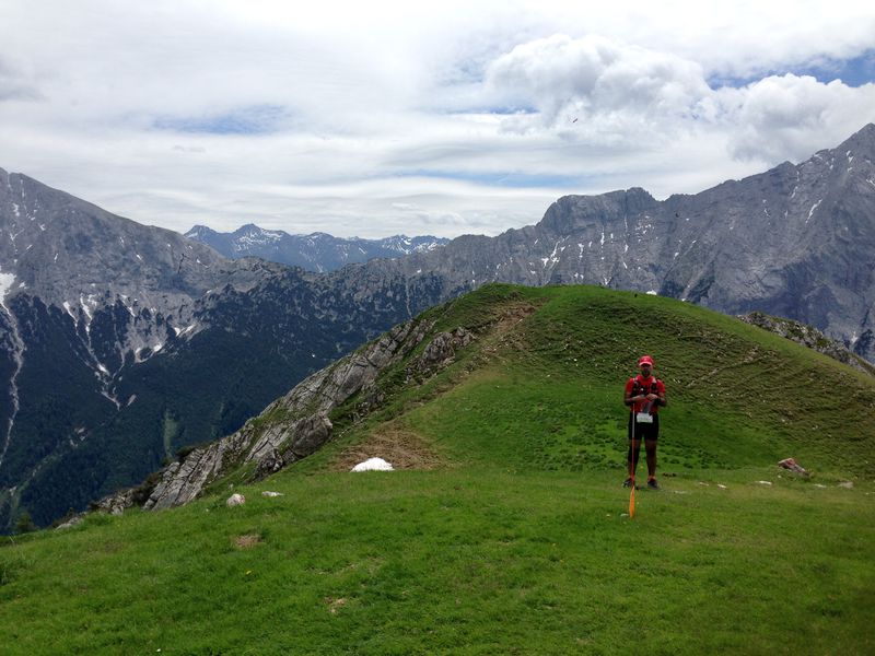 Von dort geht es zu den drei höchsten Punkten der Strecke. Nahe des Feldernjöchels geht es zwei mal auf 2100 Meter und einmal auf 2206 Meter dem höchsten Punkt der Strecke, hochalpines Gelände. Dann wieder runter auf 1400 Meter. Es zieht sich wie Kaugummi, die nächste Verpflegung will einfach nicht kommen. Für diese Strecke von lediglich 13 km brauche ich ganze drei Stunden. Dann die Hämmermoosalm (VP4) 40,8 km und 2778 hm habe ich jetzt geschafft. Aber ich fühle mich als hätte ich schon eine viel längere Strecke zurückgelegt. Ich bin mittlerweile 07:32 h unterwegs. Der Verpflegungspunkt hier ist provisorisch unter Pavillons eingerichtet und versorgt uns mit allem was wir brauchen um über den nächsten Pass zu kommen.