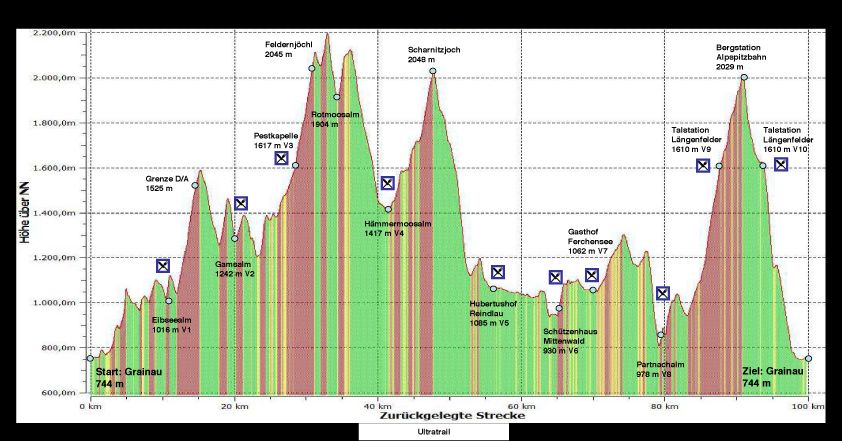 Weitere 400 Meter berghoch bis zu Bergstation der Alpspitzbahn auf 2029 Meter. Hier sind wir am höchsten Punkt der Albsspitze angelangt. Ab jetzt wird es auf den letzten 10 km bis ins Ziel nicht mehr bergauf gehen, aber 1300 m bergab. Erst aber mal wieder zur Talstation Längenfelder (VP 10) 95,8 km, 5412 hm die wir nach 20:50 h erreichen. Für diese Runde haben wir auch wieder zwei Stunden gebraucht.