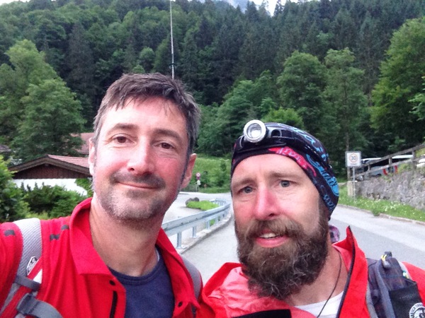 Dann weiter durch Wälder und über grüne Wiesen. Nach wenigen Kilometern passieren wir Schloss Elmau (kennen wir vom G7 Gipfel im Jahr 2015) danach dämmert es und ich muss die Beleuchtung vor der Stirn einschalten. An der Bergstation der Eckbauerbahn sind wir schon ganz dicht bei Garmisch, aber uns soll nicht der kürzeste Weg ins Ziel führen. Sodann ganz tief und mal wieder steil runter in die Partnachklamm. Nur damit es nach dem Überqueren der Partnach gleich wieder steil bergauf gehen kann. Endlich, lang erwartet die Partnachalm (VP 8) 81,9 km und 4238 hm sind zurückgelegt. Ich bin bereits 16:14 unterwegs! Aber dann, welch eine Freude, an der Verpflegung erblicke ich meinen Kumpel Christoph wieder. Also, mit Laufen ist der auch nur unwesentlich schneller vorangekommen als ich mit Gehen. So beschließen wir den Rest der Strecke gemeinsam zurückzulegen. Sind ja noch 20 km übrig und die werden es noch in sich haben! Hier an der Partnachalm trinke ich unter anderem einen Chai-Latte-Tee aus der Tüte, der mir so unheimlich gut schmeckt, dass ich mich noch Stunden später daran erfreuen werde.