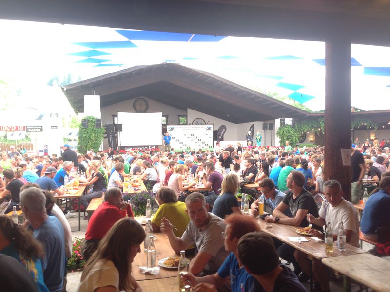 Um 19.00 Uhr fängt dann das Briefing mit Rahmenprogramm an. Hier treffen wir alte Bekannte, die wir von der Brocken-Challenge kennen und setzen uns gerne zu diesen an den Tisch. Es beginnt mit dem Einzug der Nationen – wie bei Olympia tragen Fahnenträger die Nationalbanner der 51 teilnehmenden Nationen herein. Nach Grußworten vom Organisationskomitee, Sponsoren, sowie der Bürgermeister und Kurdirektoren der verschiedenen Gemeinden um die Zugspitze - kommt es zum kulturellem Höhepunkt, dem Groaßschnalzen. Auf der Bühne spielt ein einsamer Akkordeonspieler eine Melodie, dazu steigen sechs Männer in Tracht auf die Tische und knallen in einer ohrenbetäubenden Lautstärke verschiedene Rhythmen dicht über den Köpfen der Zuschauer mit ihren Fuhrmannpeitschen. Das war schon beeindruckend. Anschließend das klassische Briefing mit Reglement, Streckenbeschreibung und Pflichtausrüstung.