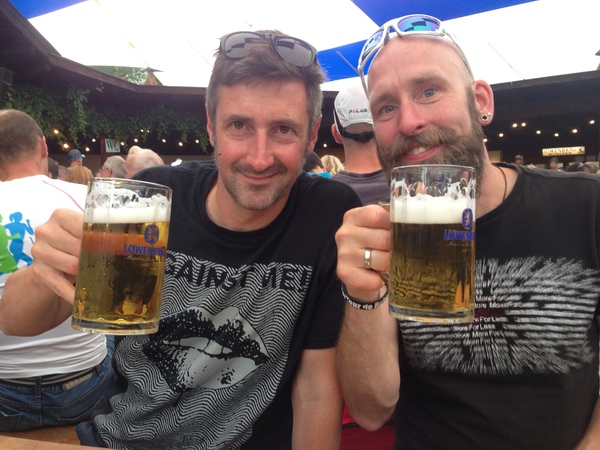 Wenige Meter weiter sind wir schon am Musikpavillon. Dort sitzen schon hunderte Läufer und ihre Begleiter unter einem weiß-blauen Himmel. Mit meiner Wertmarke kann ich mir einen guten Teller Nudeln abholen (mit Tomaten- oder Hackfleischsoße) incl. Getränk und Nachtisch. Einen Nachschlag gibt’s auf Wusch auch. Bier muss extra bezahlt werden, was auch o.k. ist.