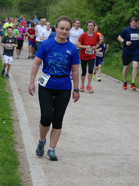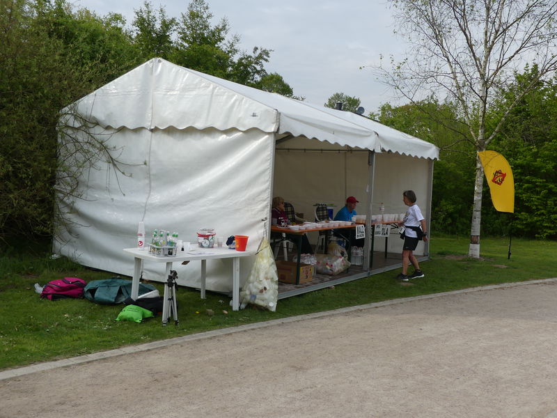 32 völlig identische Runden waren dort auf festen Sandwegen zu absolvieren, danach bog der Aktive Richtung Sportanlage ab. Die ca. 1300 Meter lange Laufrunde im Bürgerpark war auf den ersten ca. 800 Metern recht flach, es folgte ein längerer leichter Anstieg und kurz vor dem Rundenende ging es auf ca. 100 Metern bergab. So kamen bei 32 Runden doch so einige Höhenmeter zusammen. Der ganze Lauf wurde über einen Chip in der Startnummer zeitlich gemessen, die Runden über einen Chip am Schuh (das HH-Öjendorfer Messsystem). Die letzte Runde wurde angesagt, außerdem noch das Beenden der 32. Runde. Kurz vor dem jeweiligen Rundenende stand ein gut ausgestatteter Verpflegungsstand. Die ganze Strecke war mit blauen Schildern und blauweißen Flatterband erstklassig markiert.