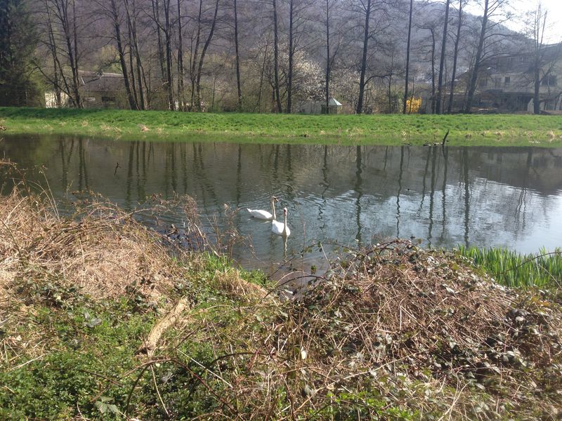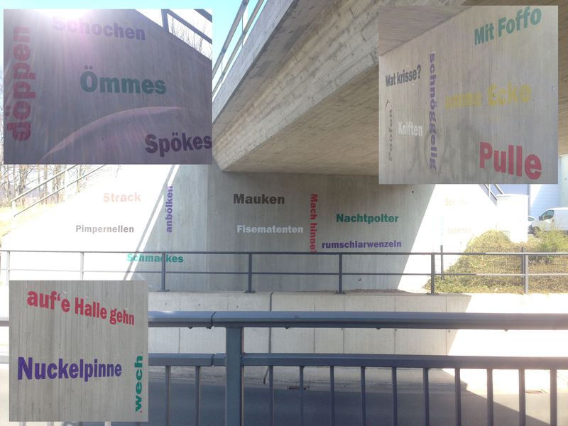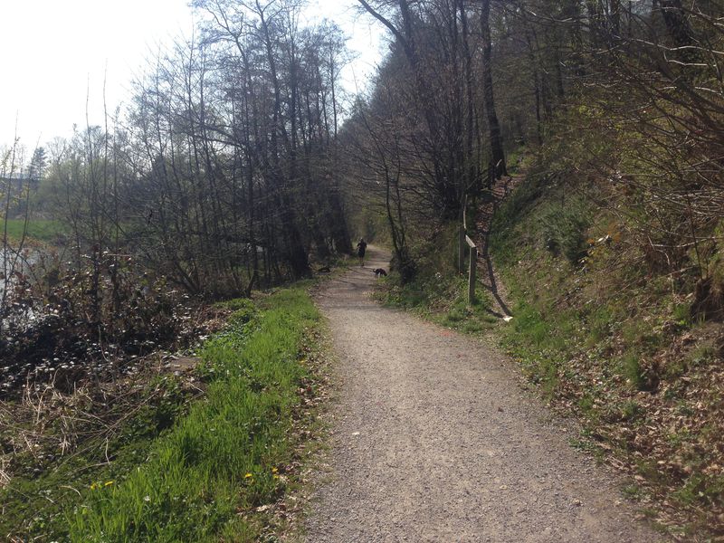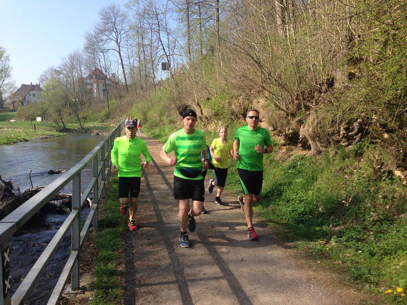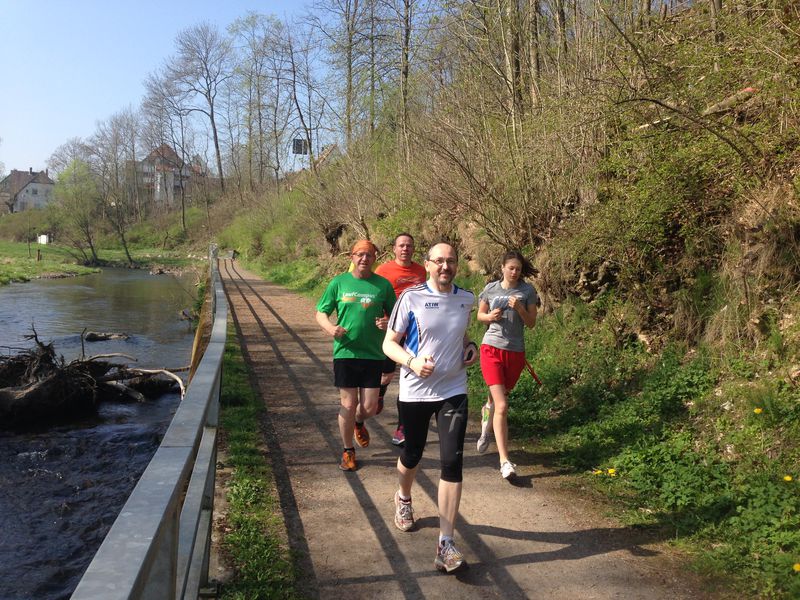 Die 5,1 km Runde hatte die Form einer 8 und verlief erst an der neu gestalteten Bürgerwiese vorbei, dann unter der neuen Behelfsdiemelbrücke und der DIEMELBRÜCKE hindurch. Sehr idyllisch am Biergarten und den beiden Minigolfanlagen (Klassisch und Filz) vorbei ins Eichenwäldchen. Ins Eichenwäldchen ist man früher immer gerne zum knutschen gegangen. Außerdem gab es dort den örtlichen Trimm-Dich-Pfad! Auch sehr sehr idyllisch am Wehr entlang, wo sich auf der aufgestauten Diemel zwei Schwäne vergnügten. Dann durch die neue Ostanbindung, unter der Bahn durch. Die Unterführung ist in bunten Lettern mit Marsberger- und Sauerländer Sprüchen verziert. Dann gleich über die östliche Diemelbrücke an der Paulinenstraße. Nach der Brücke rechts auf einen Naturweg, unter der alten Eisenbahnbrücke durch, eine kleine Treppe rauf, schon war man im Gewerbegebiet Mönchstraße. Dort ging es über Bürgersteige und kleine Straßen an der Freiwilligen Feuerwehr vorbei, bis zur Gaststätte 'Deutsches Haus'. An diesem Sonntag war das Gewerbegebiet menschenleer. Nun ging es über die DIEMELBRÜCKE rechts die geschotterte Baustraße runter, unter der DIEMELBRÜCKE durch zum Verpflegungsstand.