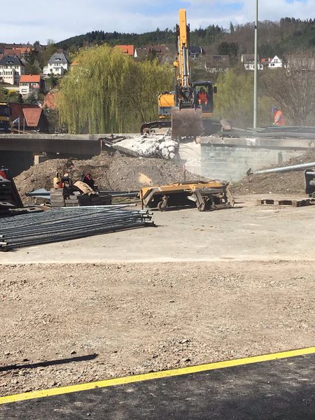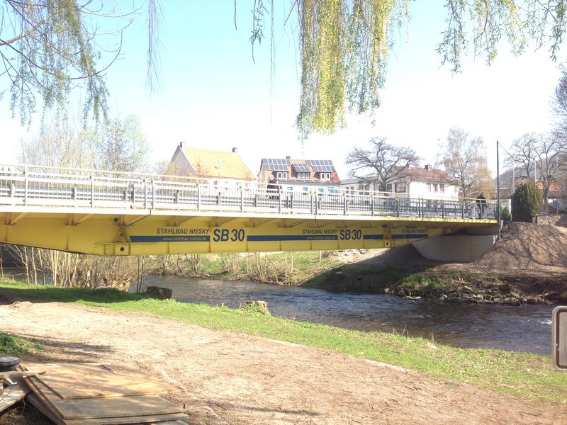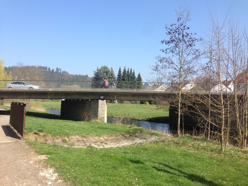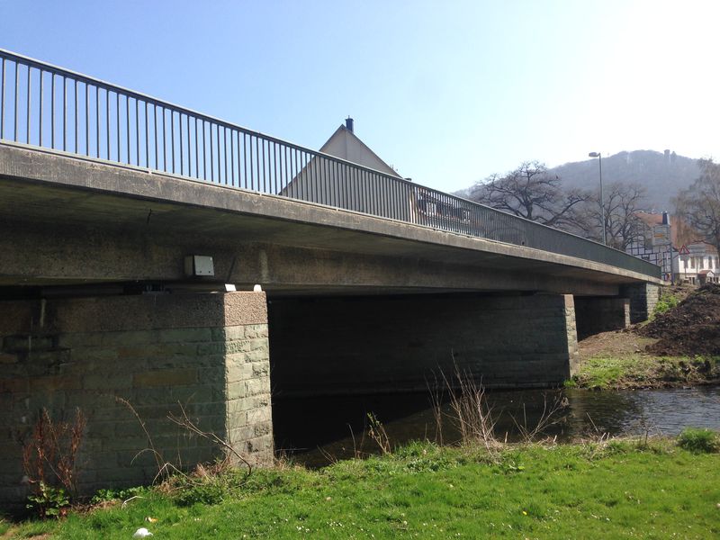 Die DIEMELBRÜCKE wurde im Jahr 1954 erbaut und ist als sogenannte Dreifeldbrücke konzipiert. Das heißt, sie liegt am Anfang und Ende auf und hat zusätzlich zwei Brückenpfeiler. Die Diemel fließt durch das mittlere Feld der insgesamt 49 Meter langen Brücke. Durch das nördliche Feld führt ein Fuß- und Radweg. Die Brücke ist dem heutigen Verkehrsaufkommen nicht mehr gewachsen, deshalb soll sie jetzt ersetzt werden.