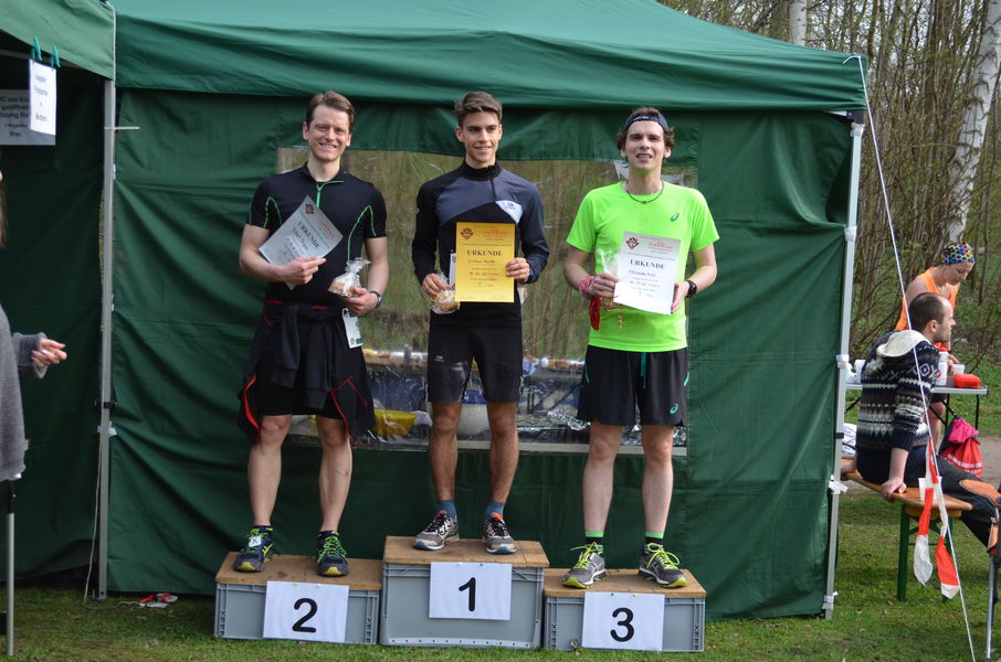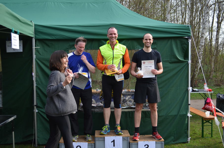 Siegerehrung der Männer, 11km Platz 2: Bernhard Pauls in 1:00:53 Platz 1: Harry Kays in 0:58:40 Platz 3: Michael Kaiser in 1:04:18