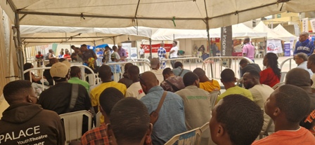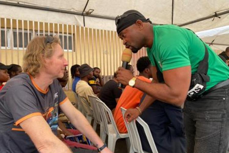 Zwischenzeitlich war Klaus aus Dänemark eingetroffen, der von Frankfurt über Doha mit Qatar Air geflogen war. Eigentlich wollte er mit Lufthansa von Billund nach Frankfurt fliegen. Aufgrund des Lufthansa-Streiks reiste er stattdessen mit dem Auto nach Frankfurt und brauchte jetzt auch dringend Schlaf. Für uns ging es nach dem Frühstück mit einem Uber-Taxi – an die Sammeltaxis in Kleinbussen, die immer mit offenen Türen fuhren, trauten wir uns nicht ran – zur Startnummernausgabe in ein Stadion in der Innenstadt. Im Nebenstadion (Basket- oder Volleyball) war ein großes Zelt mit Stuhlreihen aufgestellt, auf denen die Läufer warten, bis sie an der Reihe waren, um an den Tischen ihre Startnummer und ihr Veranstaltungslaufhemd zu bekommen. Das System funktionierte: immer wenn vorne jemand an den Tresen ging, rutschte die ganze Truppe einen Stuhl weiter. Wir haben in einer knappen Stunde nur einen Vordrängler (ganz wichtig mit Gucci-Sonnenbrille, Anzughose und Oberhemd) erlebt, alle anderen haben sich hinten eingereiht und geduldig gewartet. Zurück im Hotel weckten wir Klaus und gingen bei Domino’s Pizza essen. Bezahlen konnte man nur bar oder mit einer lokalen Bankkarte – Kreditkarten funktionierten nicht. So waren wir immer auf der Suche nach Geldautomaten „on duty“, die auch noch mit Geld geladen waren. Erschwerend konnte man höchstens Bargeld im Wert von 3,60 EUR ziehen. Das war der Preis von einer Pizza. Entsprechend häufig waren wir an dem Automaten. Am Abreisetag (Sonntag) mussten wir 8 Automaten probieren, bis uns einer endlich 11 abgegriffene alte (produziert vor der Geldumstellung im Feb 2023) Scheine ausspuckte, um die Wasserflaschen im Hotel zu bezahlen. That’s Africa 2.