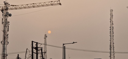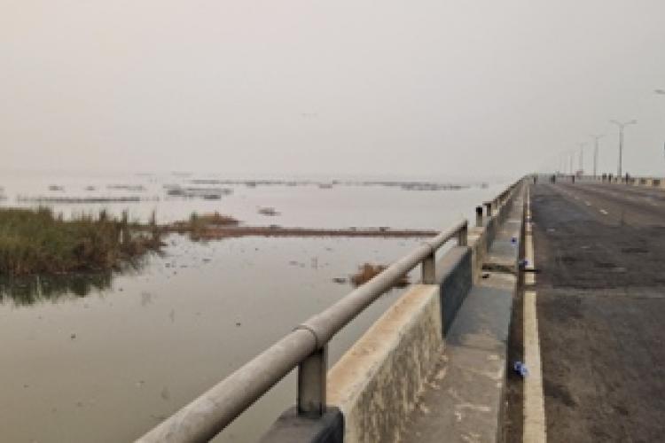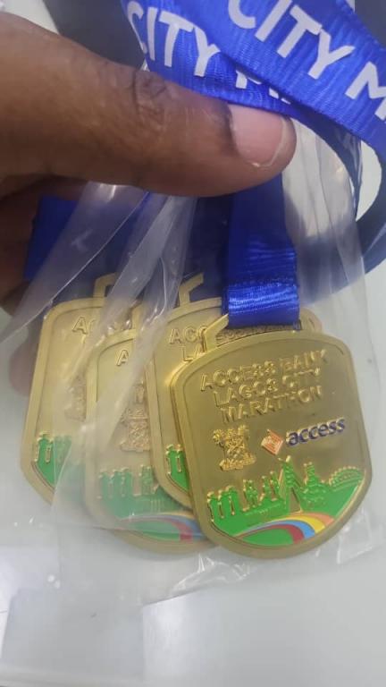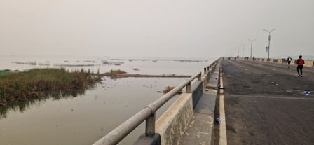Nach dem Foto liefen wir los, waren aber nicht allein unterwegs, denn diverse Einheimische wurden genauso überrascht. Die erste Stunde war es noch dunkel, doch wir liefen auf asphaltierten, verkehrsfreien Straßen, so dass sich Sturz- und Unfallgefahr in Grenzen hielten. Alle 2,5 Kilometer war ein Wasserstand, alle 5 Kilometer anfangs auch Cola oder Limonade, die von den Helfern angereicht wurden. Weiterhin waren ausreichend Streckenposten, Polizisten zur Straßensperrung und Reinigungskräfte, die die leeren Flaschen einsammelten, vorhanden. Ab Kilometer 7 führte die Strecke gut 14 Kilometer über eine 8 spurige Autobrücke, die die Lagos Lagune überspannte. Ein tolles Panorama, da sich die Fischerboote auf der Lagune befanden, mit der leicht eingetrübten Morgensonne im Hintergrund. Der Smog war erträglich und hatte den „Vorteil“, erst gegen Mittag der prallen Sonne ausgesetzt zu sein. Denn die Temperaturen waren mit 27° beim Start und später knapp über 30°C für einen wintergewöhnten Europäer nicht ohne. Laufen funktionierte aber den größten Teil und auch die anfangs noch überholenden oder „fahrtspielenden“ Nigerianer wurden auch müde und so konnte „Poppa“, wie man mich vom Straßenrand anfeuerte, später noch den ein oder anderen einsammeln. Auf den letzten Kilometern war die Straßen nicht mehr komplett autofrei, so dass die Läufer schon aus Selbstschutz teilweise marschierten, um a) Seitenabstand zu den Fahrzeugen bei unebenen Randstreifen zu halten und b) auf Kreuzungen Sichtkontakt zu den Fahrern herzustellen. Auf dem bereits erkundeten Zielgelände wartete ich noch die letzte Steigung gehend ab, um dann wieder in den Laufschritt zu wechseln und da hatte ich dann noch ein paar Überholungen. War allerdings egal, denn im Zielbereich gab es offensichtlich schon länger keine Medaillen mehr. Der Veranstalter entschuldigte sich später auf facebook, dass die Helfer bedroht wurden und so auch an Nichtläufer Medaillen verteilten. Keine Ahnung, ob das stimmt oder der Veranstalter einfach zu wenige bestellt hat. Da es auch keine kostenlose Zielverpflegung mehr gab, ging ich also wieder zurück bis zu einem Laden, um Pepsi und Wasser für mich, Doris und Klaus (Getränke für deren letzte Kilometer) zu kaufen. Denn auch das Wasser auf der Strecke wurde schon bei mir knapp bzw. die Stände abgebaut, obwohl ich 2 Stunden vor Zielschluss eingelaufen bin. Leider bin ich auf dem Rückweg falsch abgebogen und habe somit Doris erst nach ihrem Zieleinlauf getroffen. Die Getränke schmeckten ihr dann auch noch. Klaus war da schon wieder im Hotel, denn der reiste noch am Nachmittag zurück nach Hause. Wir gingen langsam zurück zum Hotel, „baten“ um Wasser zum Duschen und erholten uns. Diesmal ohne Club-Party, nur mit der sich immer wiederholenden Musik (Madonnas „La Isla Bonita“ können wir jetzt mitsingen!). Wir blieben im Zimmer und aßen und tranken unsere Vorräte. Morgens am Abreisetag wieder um „Wasser bitten“, um danach zu erfahren, dass der Koch außer Haus ist und es kein Frühstück gäbe. Man wollte uns etwas draußen besorgen, was wir aber extra bezahlt haben. Die Hotelbezahlung wurde zur Arie, denn bei der Buchung hieß es „Kein Bargeld“. Zu dumm, wenn das Kreditkartenlesegerät angeblich kein Empfang hat und der Manager um Zahlung in US-Dollar bittet. Wir sind erfahren genug, darauf vorbereitet zu sein. Der nächste „Knüppel“ war die Ablehnung von Scheinen, die älter als 2012 sind. Wir hatten Glück, dass unsere Sammlung jung genug war. Bei Klaus wurde tatsächlich ein Schein zurückgewiesen. Bei unserem nächsten Bankbesuch in Deutschland werden wir also drauf achten, dass wir nicht nur druckfrische, sondern auch NEUE Scheine für die Reisekasse erhalten. Nach der Bezahlung wollten wir dann auch noch eine Quittung mit Betrag in Dollar und Hotelname. Die Rezeptionistin war der Verzweiflung nahe. Wie gesagt: wir haben unsere Erfahrungswerte!