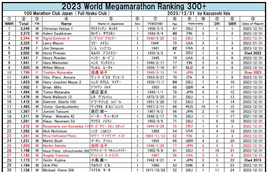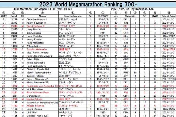 Das World Megamarathon Ranking(WMMR) 300+ mit dem Stand vom 31.12.2023 ist nun unter der Statistik zu finden.