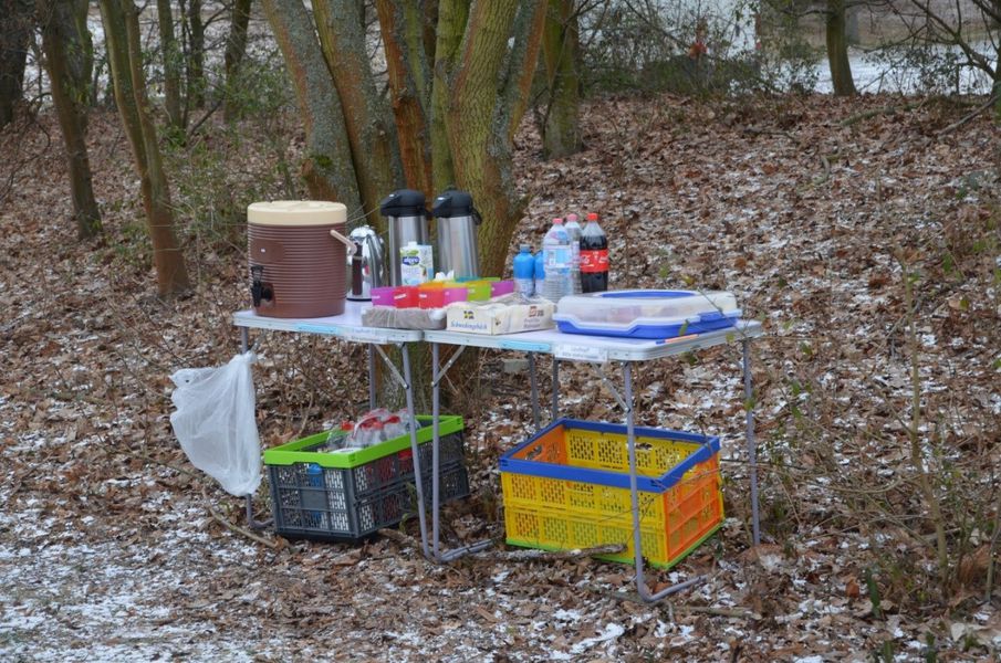 Bis zum Abbau nach über sechs Stunden gab es noch warmen Tee, Kaffee und Brühe, Kaltgetränke, Obst, Kekse und Lakritze. Der Clou – für mich völlig ungewohnt: Es gab personalisierte Becher :-)