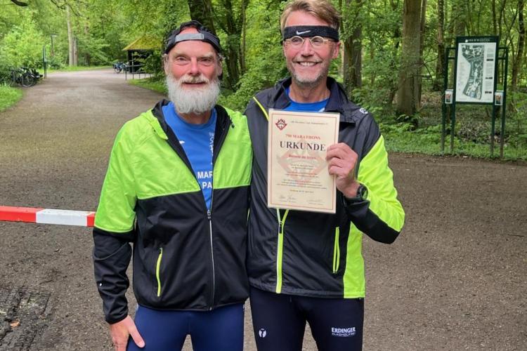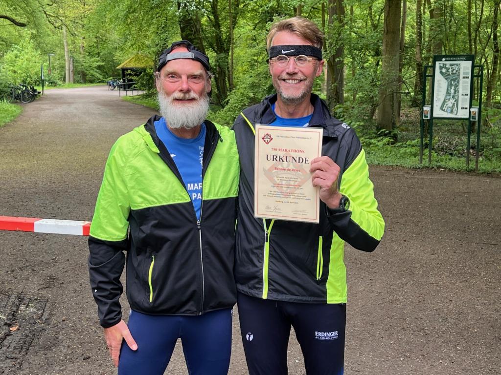 Der Veranstalter des Laufs, 100MC Mitglied Ingo Kloss, überreichte nach dem Zieleinlauf die Urkunde des 100 Marathon Clubs. Im Anschluss an die Ehrung startete Bennie sofort zum 751. Marathon durch den Bremer Bürgerpark. Die Trainingskilometer kann er gut gebrauchen. Der Niederländer, der am liebsten in Deutschland läuft, hat sich nämlich zum Deutschlandlauf in diesem Jahr angemeldet.