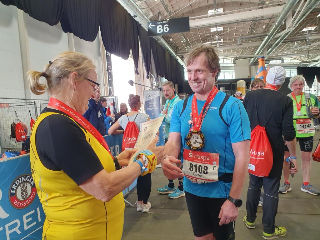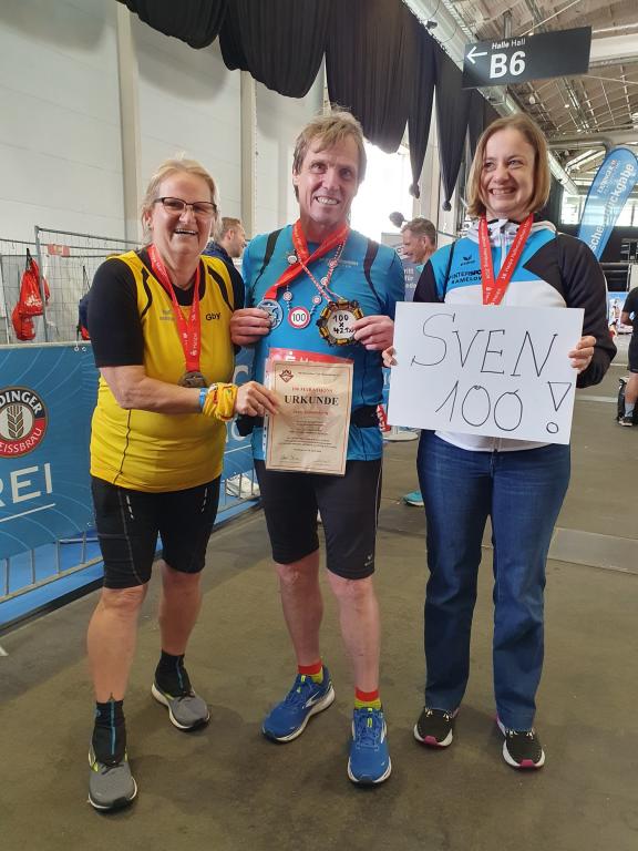 Und nun, Ende April 2024 lief Sven bei 20 Grad im Schatten erneut durch die Hansestadt und verabschiedete sich innerlich vom zweistelligen Zählerstand. Nach 4:48:31 Stunden erreichte er das Ziel auf dem roten Teppich und erhielt gleich mehrere Medaillen um den Hals (siehe Fotos). 100MC Vorstandsmitglied Gabriele Eisele überreichte im Anschluss an den Lauf in der Halle für die Zielverpflegung die Vereinsurkunde zum Jubiläum.