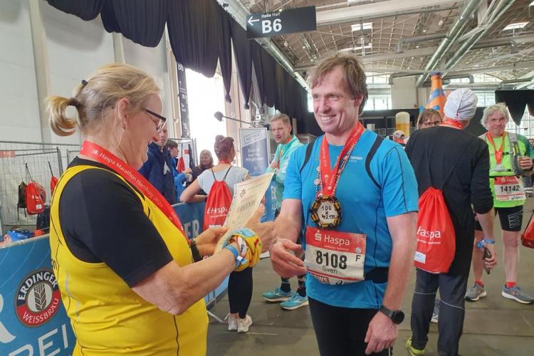 Sven kommt aus Hemmingstedt, einer kleinen Gemeinde im Kreis Dithmarschen in Schleswig-Holstein. Gefeiert hat er sein Jubiläum aber im ganz großen Stil: beim ausgebuchten 38. Hamburg Marathon mit 15.000 Marathonis, 4.600 Halbmarathonis und 1.600 Staffeln.