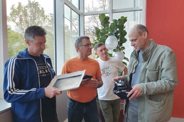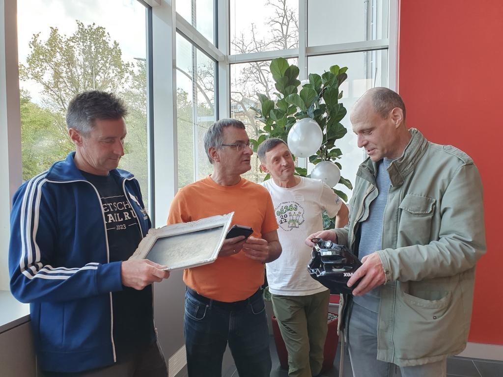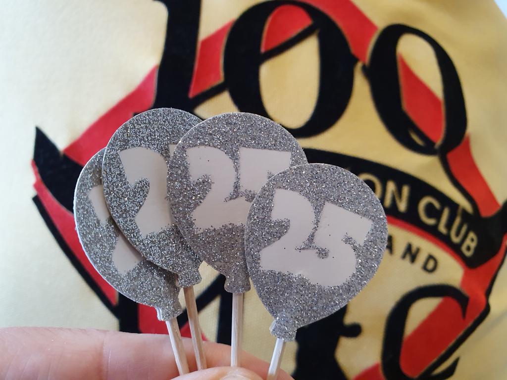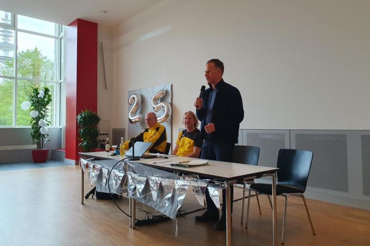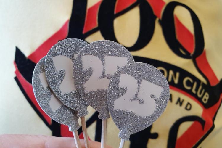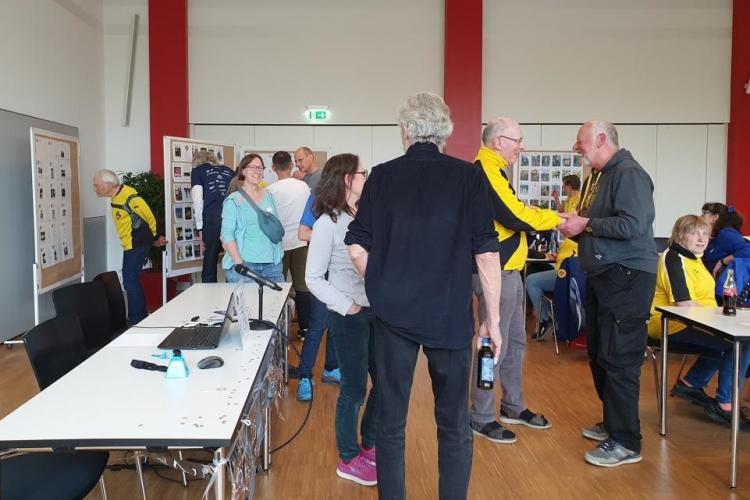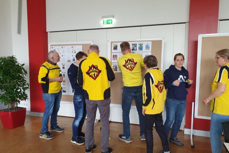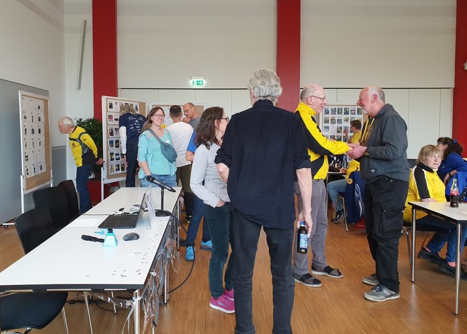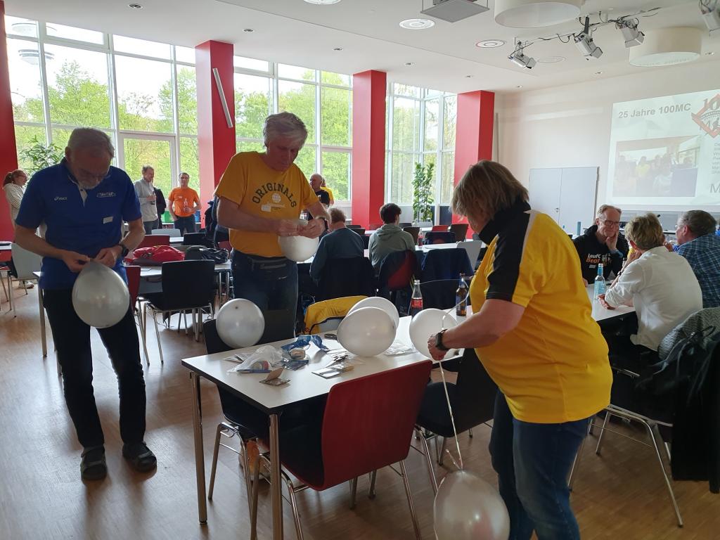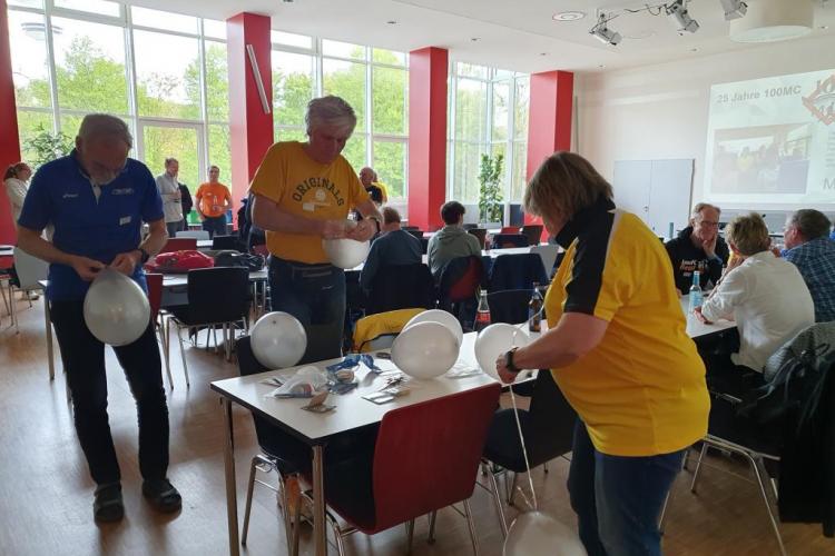 Viele helfende Hände schmückten den großen Saal mit Ballons, Girlanden und Streudeko. Die Cover sämtlicher Clubhefte seit 1999 wurden an Pinnwänden zur Schau gestellt – eine Idee, die Sigrid Eichner bei einem Interview zum 25-jährigen Bestehen des 100MC bereits Ende 2023 angesprochen hatte. Ein Beamer projizierte eingereichte Lieblingsfotos der Vereinskameraden aus den vergangenen Jahrzehnten an die Stirnseite des Raums [Link zur Präsentation]. Vor der Fensterfront konnten sich die Anwesenden mit diversen alkoholfreien Getränken versorgen und von den selbst gebackenen Glückskeksen naschen. Die Stimmung war ausgelassen: Man begrüßte sich, man unterhielt sich, man lachte.