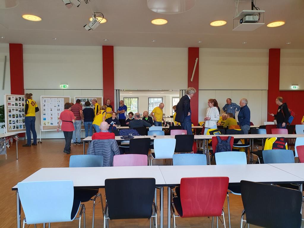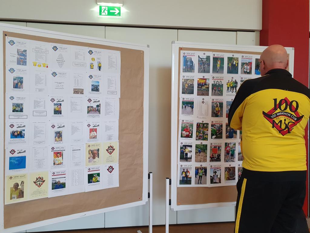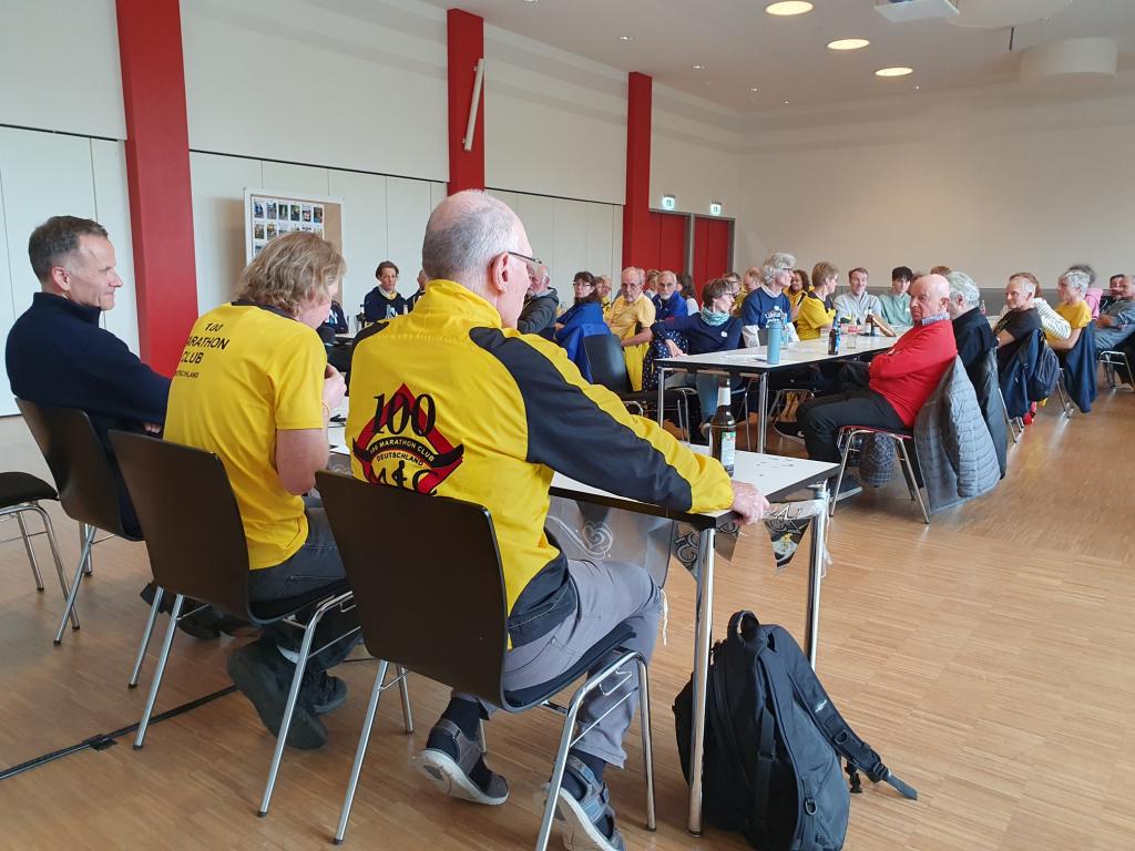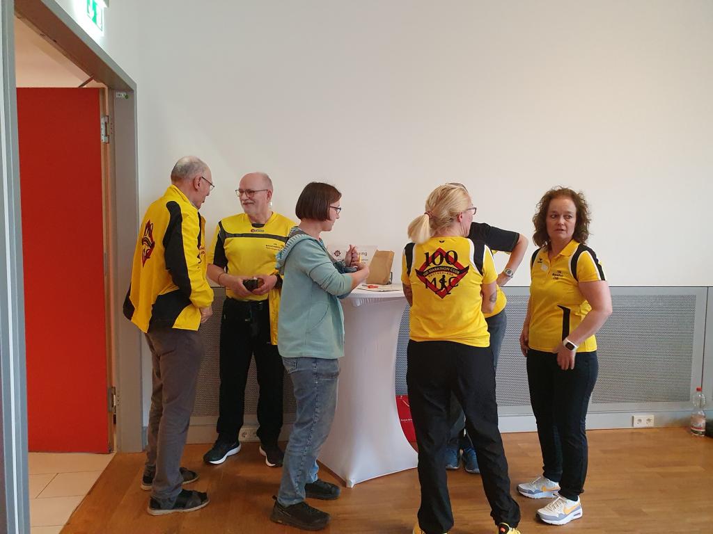 Im sehr gepflegten Haus des Sports unweit der Messehallen, wo sich die Startnummernausgabe des Hamburg Marathons befand, wurde am 27.04.2024 ab 15 Uhr gefeiert. Doris und Mario Sagasser begrüßten die etwa 60 gemeldeten Teilnehmerinnen und Teilnehmer am Counter. Man trug, wenn vorhanden, 100MC Vereinskleidung. Stand der eigene Name nicht auf der Brust, wurde ein Namensschild angefertigt, so dass sich die Anwesenden, die aus ganz Deutschland nach Hamburg angereist waren, persönlich ansprechen konnten.