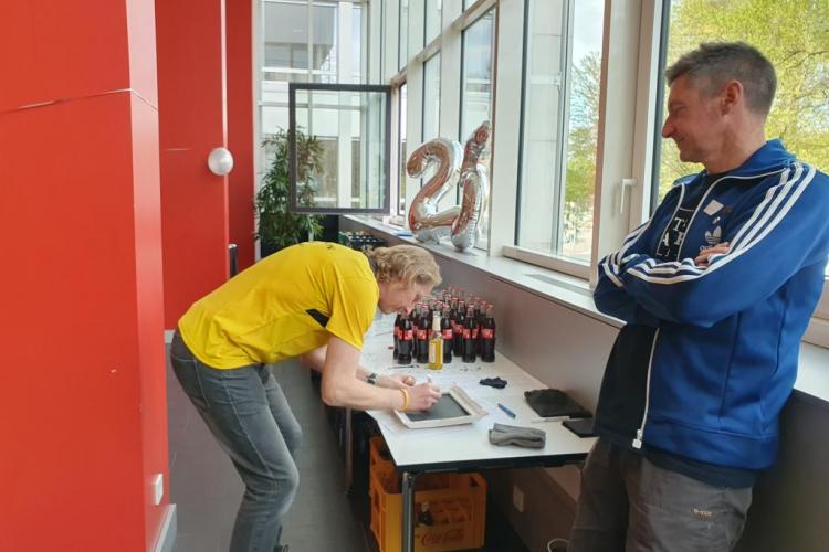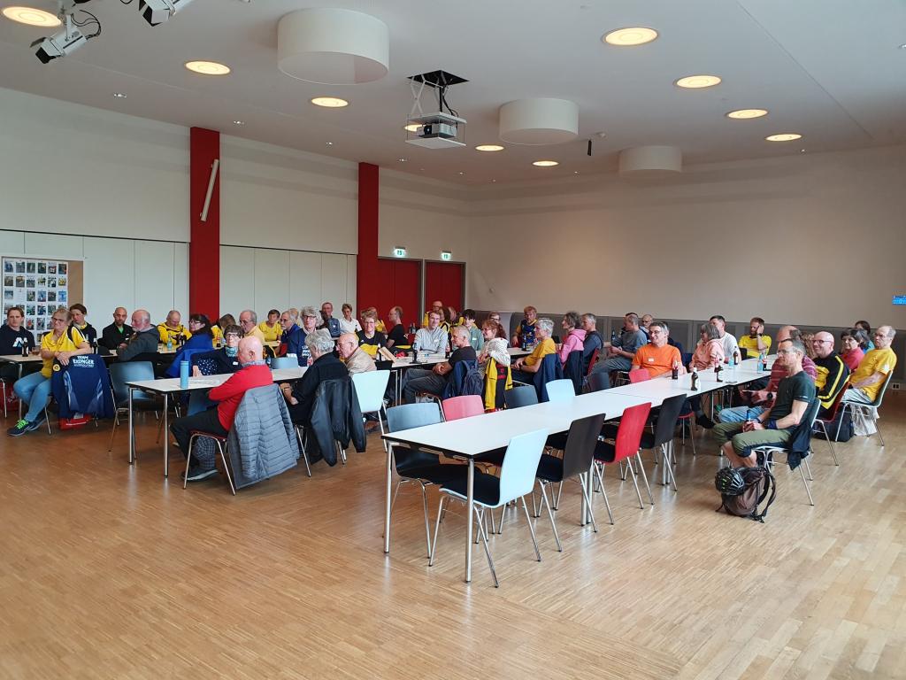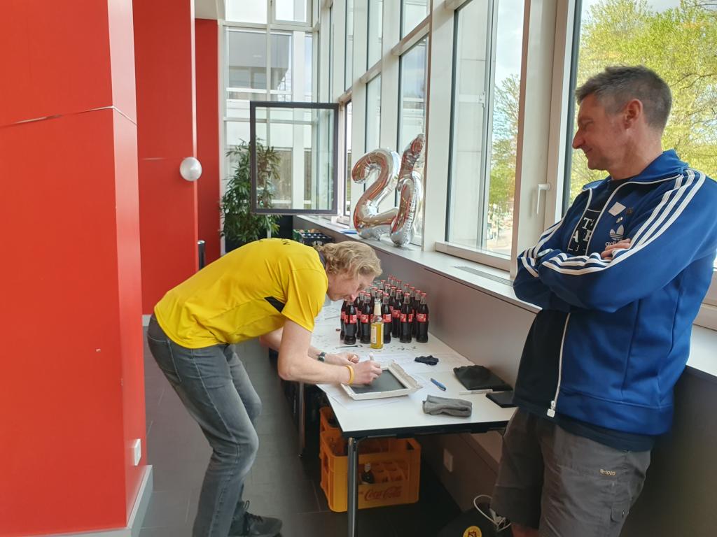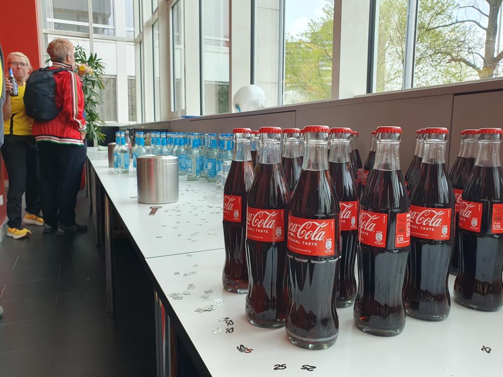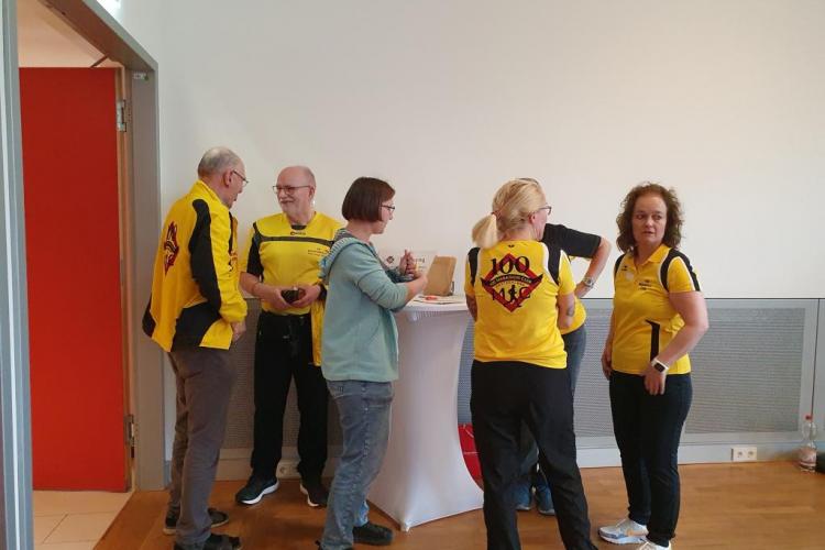 Im sehr gepflegten Haus des Sports unweit der Messehallen, wo sich die Startnummernausgabe des Hamburg Marathons befand, wurde am 27.04.2024 ab 15 Uhr gefeiert. Doris und Mario Sagasser begrüßten die etwa 60 gemeldeten Teilnehmerinnen und Teilnehmer am Counter. Man trug, wenn vorhanden, 100MC Vereinskleidung. Stand der eigene Name nicht auf der Brust, wurde ein Namensschild angefertigt, so dass sich die Anwesenden, die aus ganz Deutschland nach Hamburg angereist waren, persönlich ansprechen konnten.
