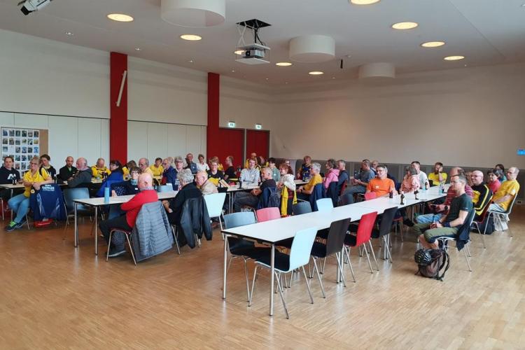 Im Anschluss gab es ein leckeres Nudelessen und Pressewartin Jana Bieler lud alle Anwesenden zu einer Fotosession ein. Vor einem roten Pfeiler in der Ecke des Saals posierten über 50 Personen mit einer Schiefertafel, auf der jeder einzelne zuvor die Anzahl der bis dato gelaufenen Marathons notiert hatte. [Link zur Galerie]