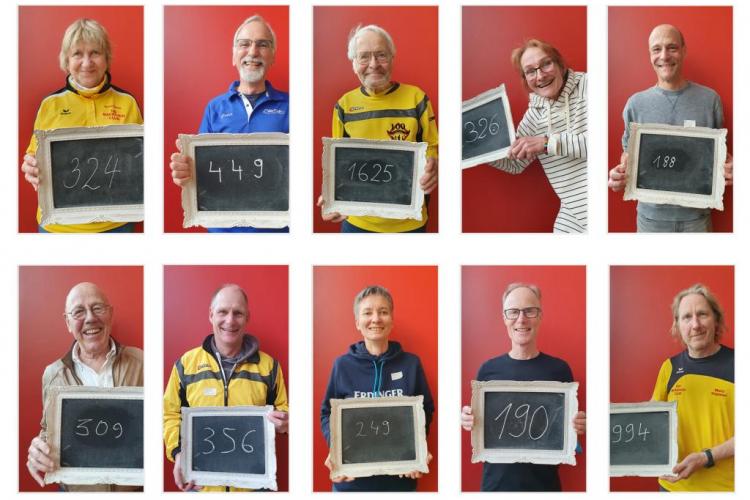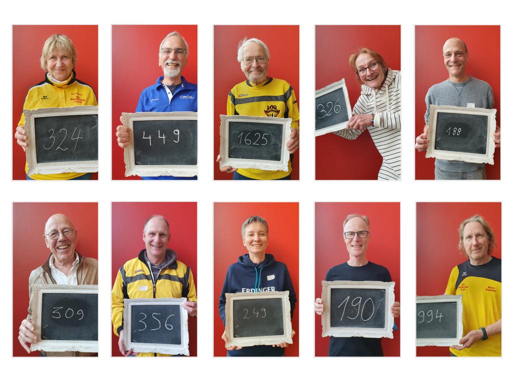 Diese Bildergalerie wurde bei der Jubiläumsfeier am 27. April 2024 in Hamburg aufgenommen. Anlässlich des 25-jährigen Bestehens des 100 Marathon Clubs posierten 51 Vereinsmitglieder und Gäste vor der Kamera. Auf der Schiefertafel haben sie ihren jeweiliger „Zählerstand“ zum Stichtag (27.04.2024) handschriftlich notiert, d.h. die Zahl der gelaufenen (Ultra-)Marathons.