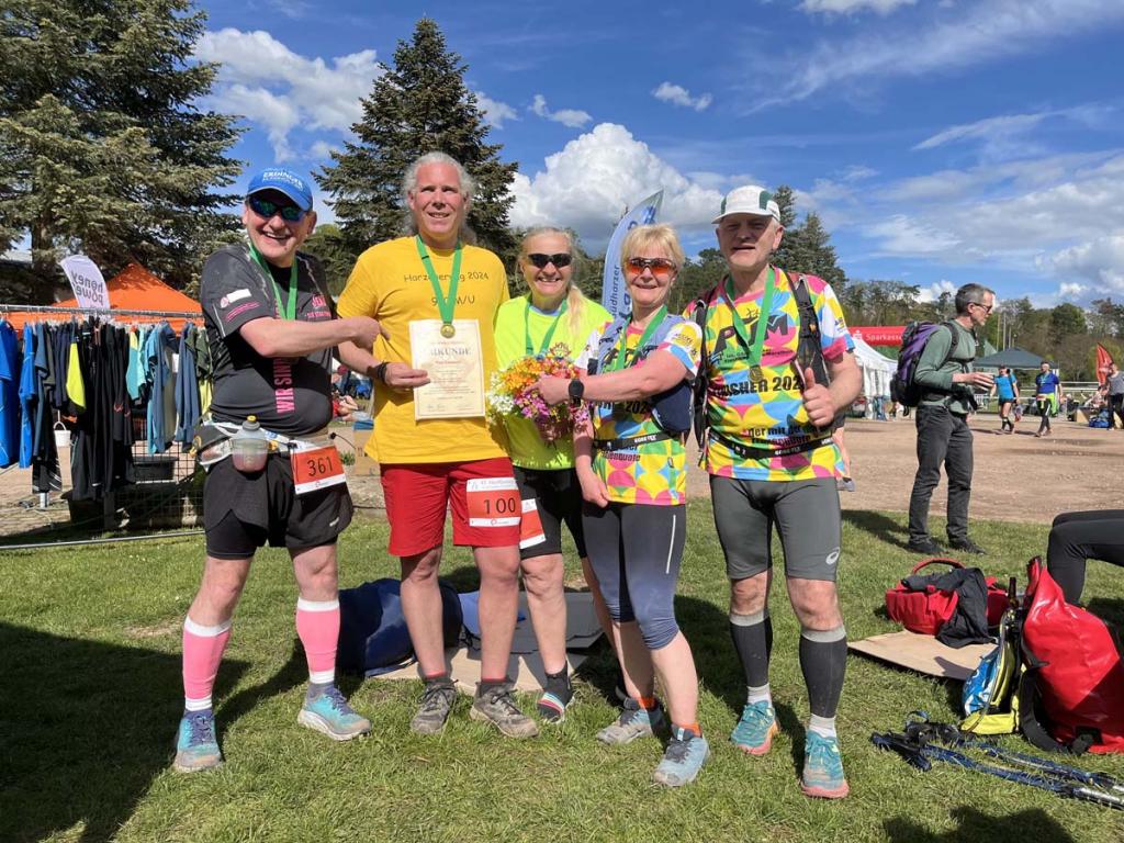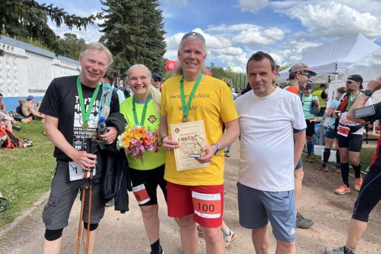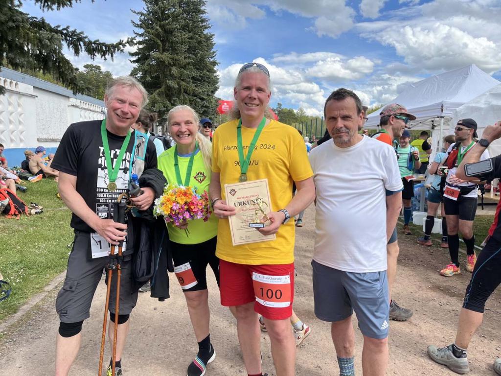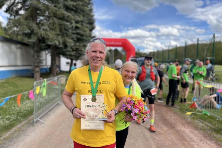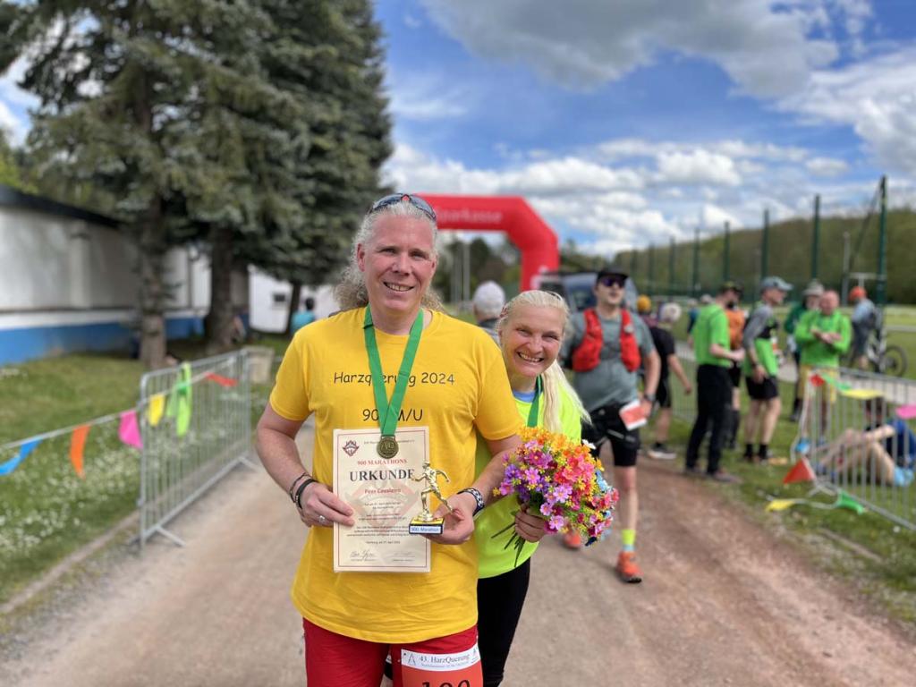 Die Harzquerung über 53 km lief Peer wie immer zusammen mit seiner Frau Claudia, die bereits zum 30. Mal bei diesem Lauf dabei war. Unser Sportwart Michael war auch unter den Läufern und organisierte für Peer die passende Jubiläumsurkunde, die Peer im Ziel feierlich von seiner Frau Claudia überreicht wurde. Zudem gab es einen kleinen selbst gestalteten Pokal, ein T-Shirt und natürlich einen bunten Blumenstrauß.