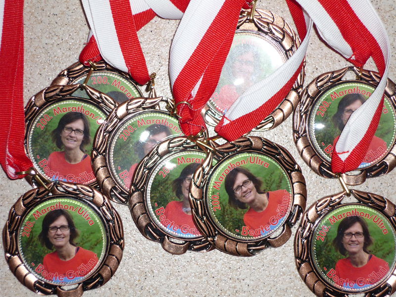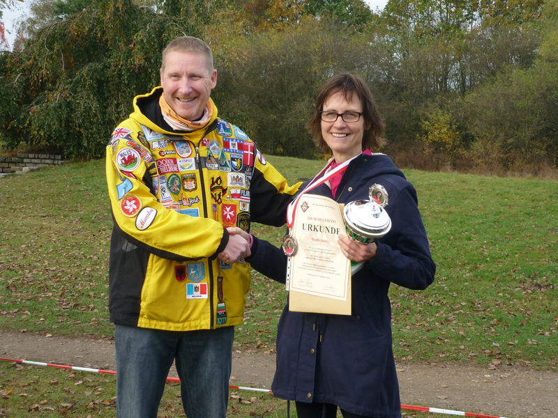 Star des Tages war natürlich Beate Gröhn bei ihrem Heimspiel. Beate lief am 22.05.2011 in Hamburg ihren ersten Marathon und konnte am 30.11.2014 ihren 100. Marathon/Ultra in Stuvenborn in ihre Statistik bringen. 5,5 Jahre nach ihrem ersten Marathon beendete sie nach 4:24:22 Stunden ihren 200. Marathon/Ultra. Alle Runden absolvierte sie übrigens mit ihren Kindern, die als Staffelläufer aktiv waren. Im Ziel gab es neben der Medaille und der Soforturkunde auch noch von Quentsch einen Pokal überreicht. Später überreichte Mario Sagasser die 100 Marathon Club Urkunde für den 200. Marathon/Ultra.