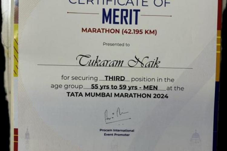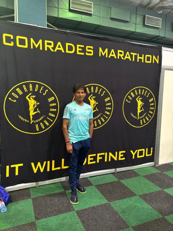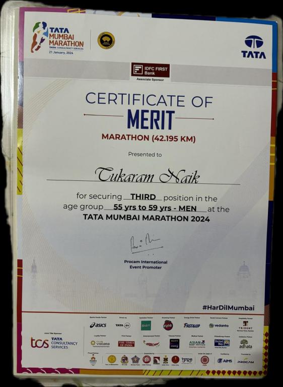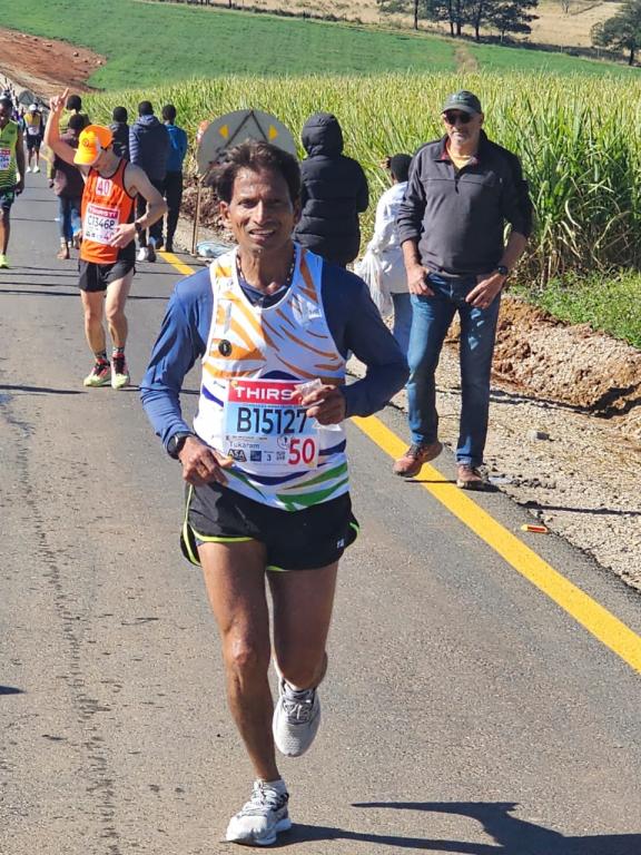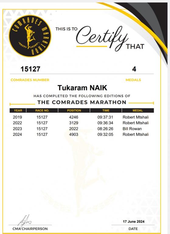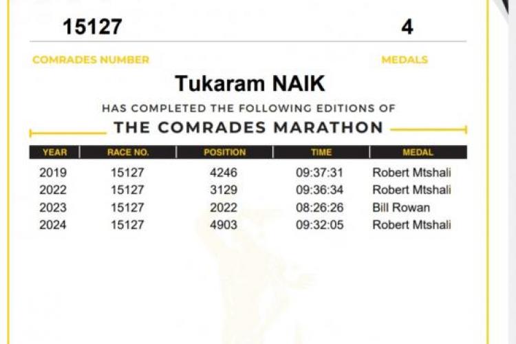 Unser Clubmitglied Tukaram Naik aus Indien hatte 2019, 2022, 2923 und 2024 den Comrades Ultra Marathon erfolgreich beendet, was auch auf seiner Urkunde mit Zielzeiten angegeben wurde. Tukuram, ein reiner Vegetarier, beendete auch den Tata Mumbai Marathon 2024 mit Verdienst auf dem 3. Platz in der Alterskategorie 55-59."