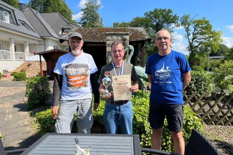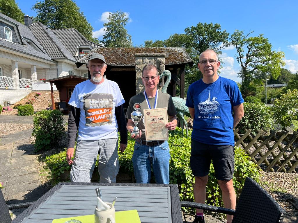 Dieses Jubiläum fand beim 22. RP-Ultralauf 3-Türme-Lauf XL über 60 Kilometer mit etwa 1.300 Höhenmetern in Bad Münder (ebenfalls Niedersachsen) statt. Wolfgang hatte sich also keinen "einfachen" Marathon für diesen besonderen Tag ausgesucht. Zusammen mit Vereinskameradin Jenny Engler sowie Marion und Jochen Konradt kam der Jubilar nach 8:43 Stunden ins Ziel. 100MC Mitglied Heiko von der Ahé überreichte anschließend die Urkunde zum 300. Marathon.