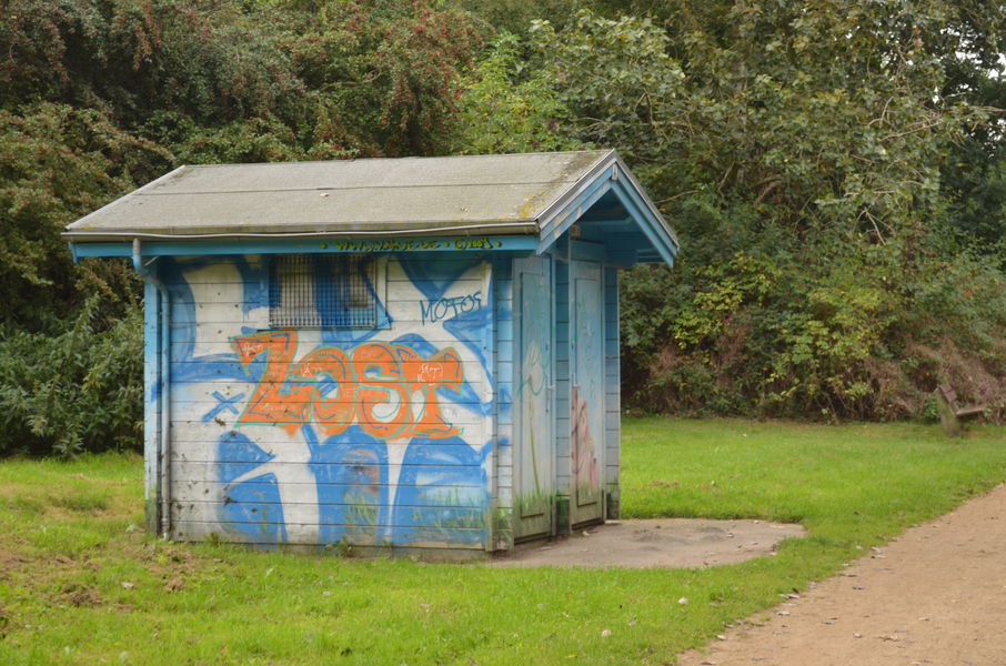 Stark bemalt, weniger stark geöffnet: Das Klohäuschen