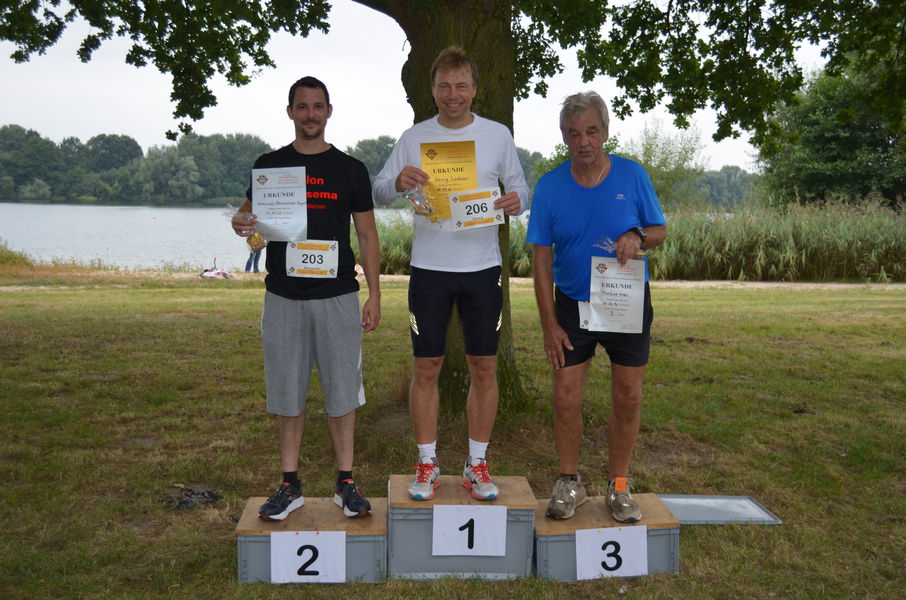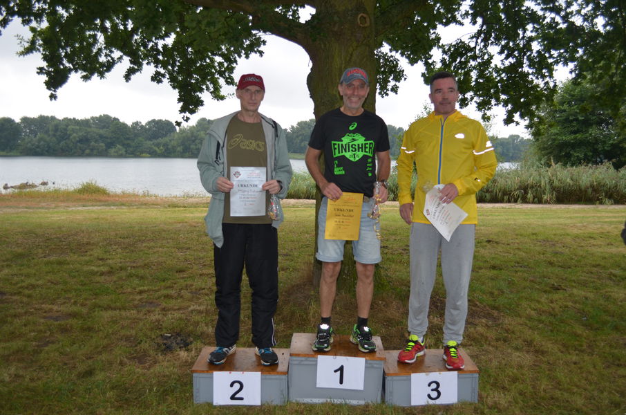 Siegerehrung 10km bei den Männern: Alexander ( 2. in 1:05:29 ), Georg ( Sieger in 0:59:02 ) und Manfred ( 3. in 1:26:40 )