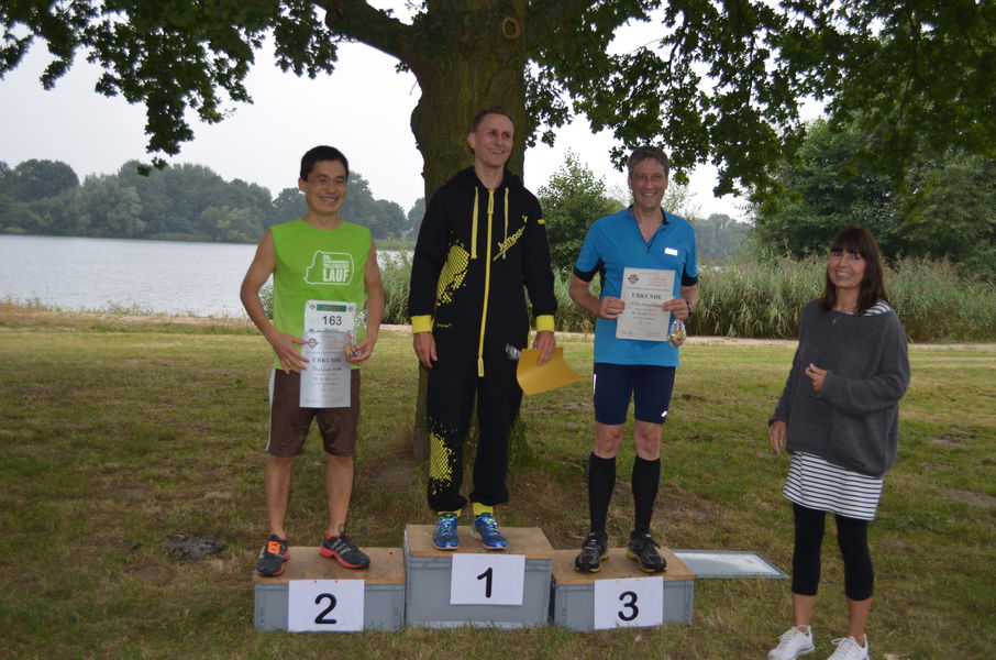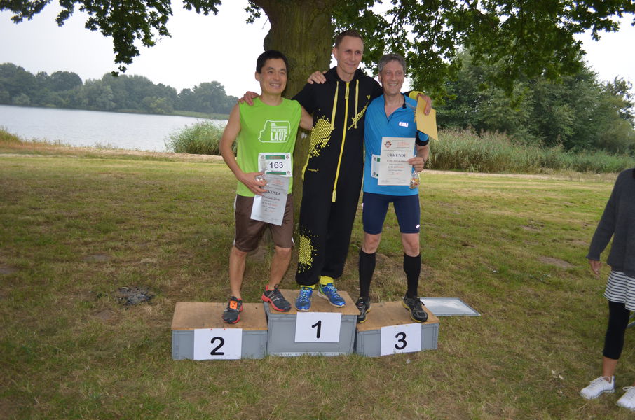 Siegerehrung der Männer beim Halbmarathon: Masafumi (2 in 1:41:43 ), Stefan ( Sieger in 1:37:45 ) und Eike-Achim ( 3. in 1:47:27 )