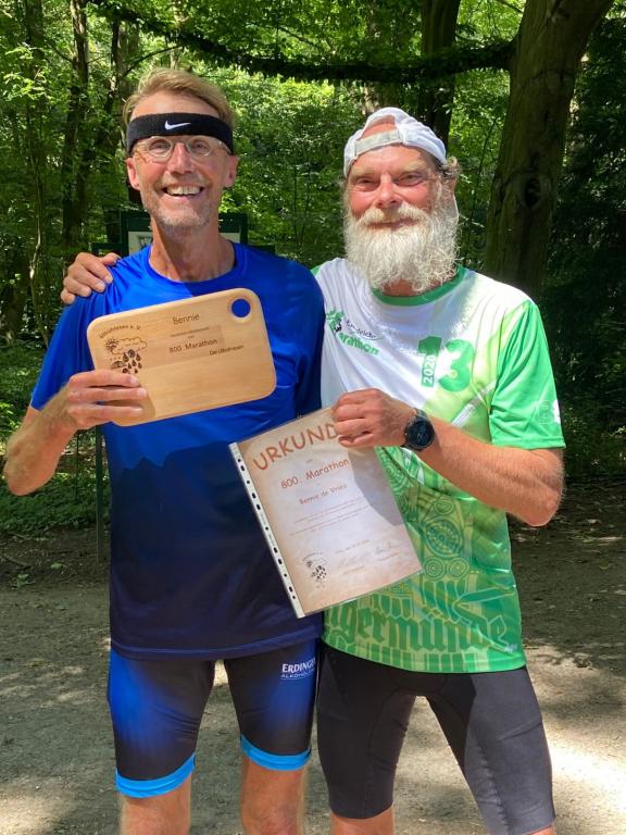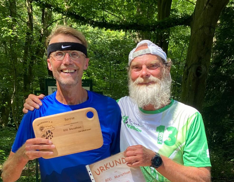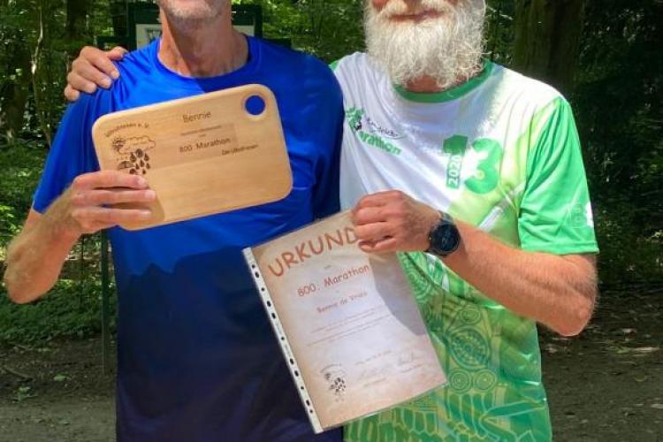 100MC Mitglied Martina Ramthun aus Hamburg und Ralf Dembeck aus Lintig veranstalteten die HaBuLiLa-Laufserie, an dessen 7. Tag Bennie nun seinen 800. Marathon feierte. 100MC Mitglied Ingo Kloss überreichte im Namen des Ultrafriesen e.V. die Urkunde und das obligatorische Holzbrett zum Jubiläum. Ingo und Bennie waren die einzigen Teilnehmer dieser Serie, die alle sieben Läufe erfolgreich absolvieren konnten.