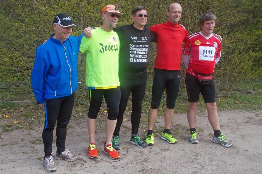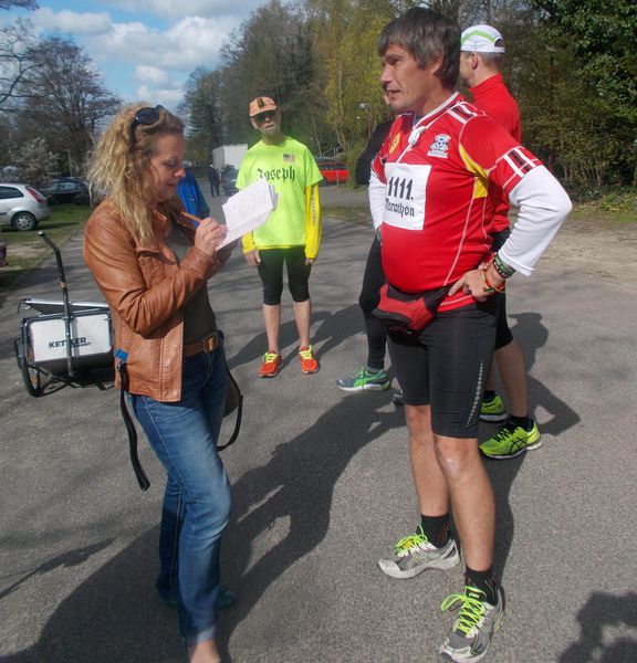 Als kürzlich ein Reporter einen Bericht über meinen 1110. Marathon in Hamburg schrieb, fragte er gleich, wann denn die Nummer 1111 wäre, und wenige Tage vor dem Schnapsmarathon erschien dann noch ein Artikel in der Lokalzeitung. Dieser wurde wohl auch von der Konkurrenzredaktion gelesen. Und als ich gerade auf dem Weg zum Start war, rief mich eine Reporterin an; sie wäre jetzt in der Berliner Straße und wo wäre denn der Start. Als ich ihr sagte, dass ich in 5 Minuten käme, meinte sie, ich solle mich beeilen, sie hätte nicht so viel Zeit. Zum Abschied sangen wir Läufer ihr dann noch die Europahymne vor, bevor es mit leichter Verspätung los ging.