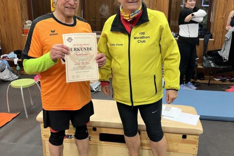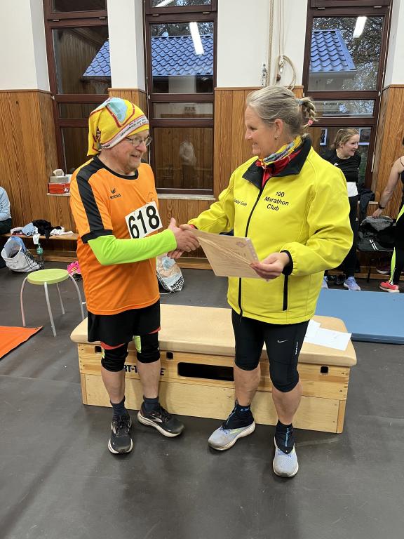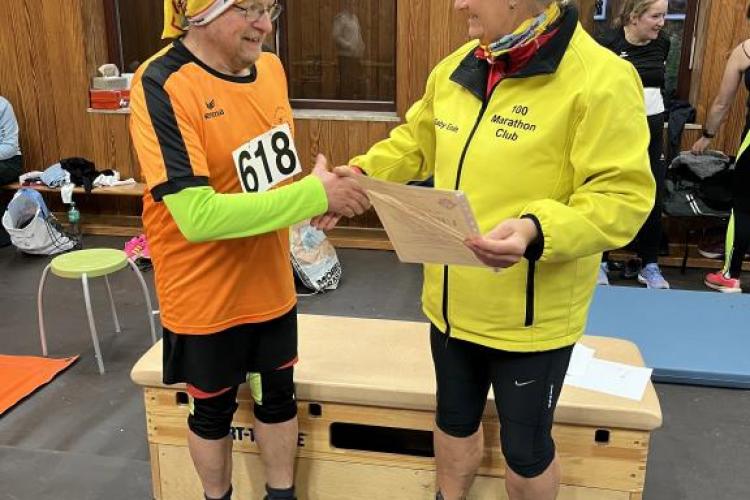 Bernd, der am 1. April 2023 beim letzten Marathon um den Öjendorfer See die 100 knackte und Mitglied in unserem Verein wurde, hat also nun bereits eine zwei vorne. 100MC Vorstandsmitglied Gaby Eisele übergab ihm feierlich die Urkunde und einen Kuchen ihm zu Ehren gab es ebenfalls.