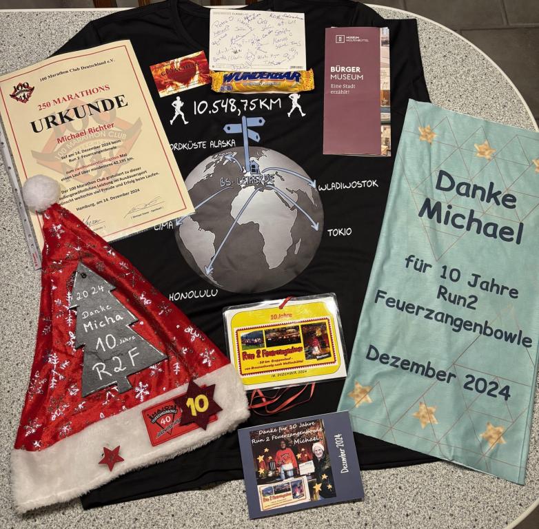 Am Ende der Veranstaltung wurde ihm die Urkunde des 100 Marathon Clubs übergeben und nach einer Festrede mehrere Präsente zum 10-jährigen Jubiläum überreicht.