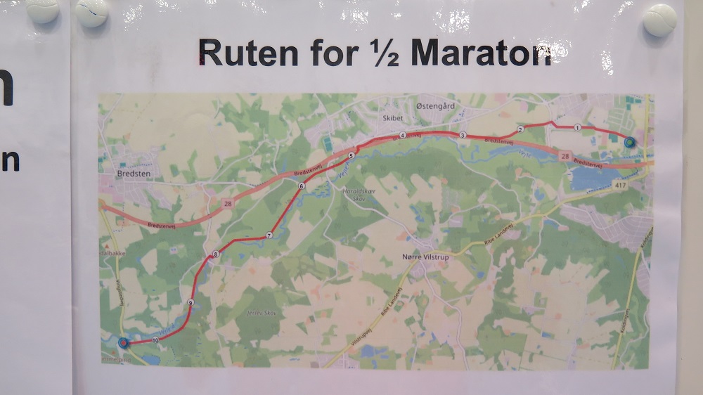 Die Startgebühr für den Marathonlauf betrug bei frühzeitiger Anmeldung knapp 55 Euro (inklusive ein Essen nach dem Lauf). Start und Ziel waren in der Sporthalle eines großen Mehrzweckkomplexes (Konferenzsäle, Schwimmhalle, Restaurant, Sporthalle etc.) in Vejle.