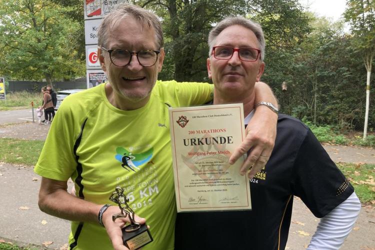 Unser Vereinsmitglied Wolfgang Peter Mnich hat am Samstag, 11. Oktober 2025 seinen 200. M/U beim 15. BayArena Marathon gefinisht – natürlich im Schatten des Stadions seines Herzensvereins.