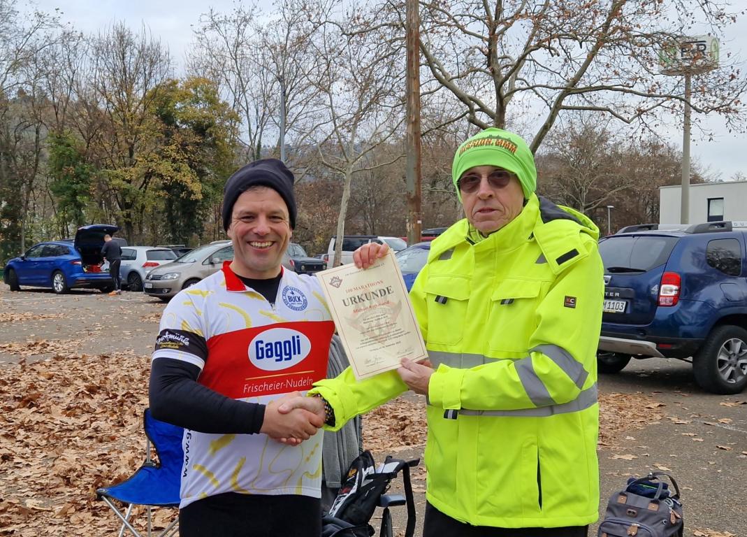 "Am Sonntag, 23.11.2025 bekam ich die Gelegenheit, meinen 100. Marathon beim Rössle RunMob in Stuttgart absolvieren zu dürfen. Die anspruchsvolle Strecke bei arktischen Temperaturen war recht kurzweilig, da dieser Lauf wie ein kleines Familientreffen der Läufer aus und um Stuttgart ist. Besonders gefreut hat mich, die Urkunde von dem 100MC Urgestein KLaus Neumann empfangen zu dürfen.