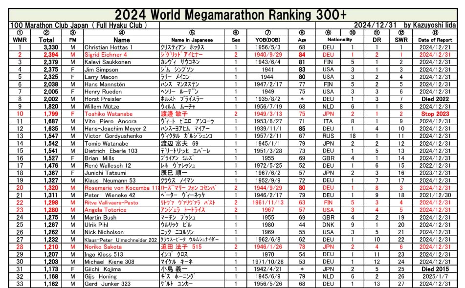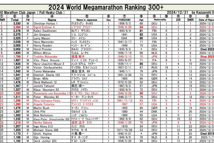 208 Läufer/innen über 300 Marathons; davon 114 mit 300 bis 499 Marathons
