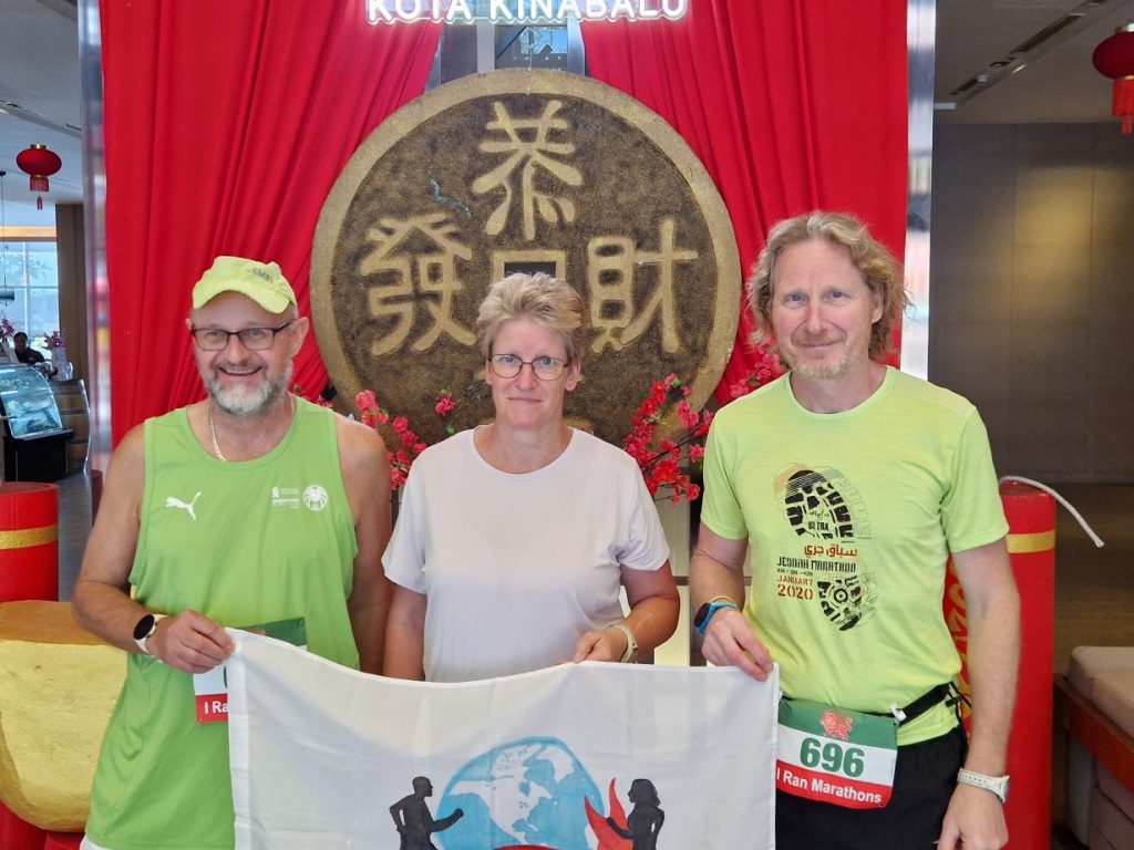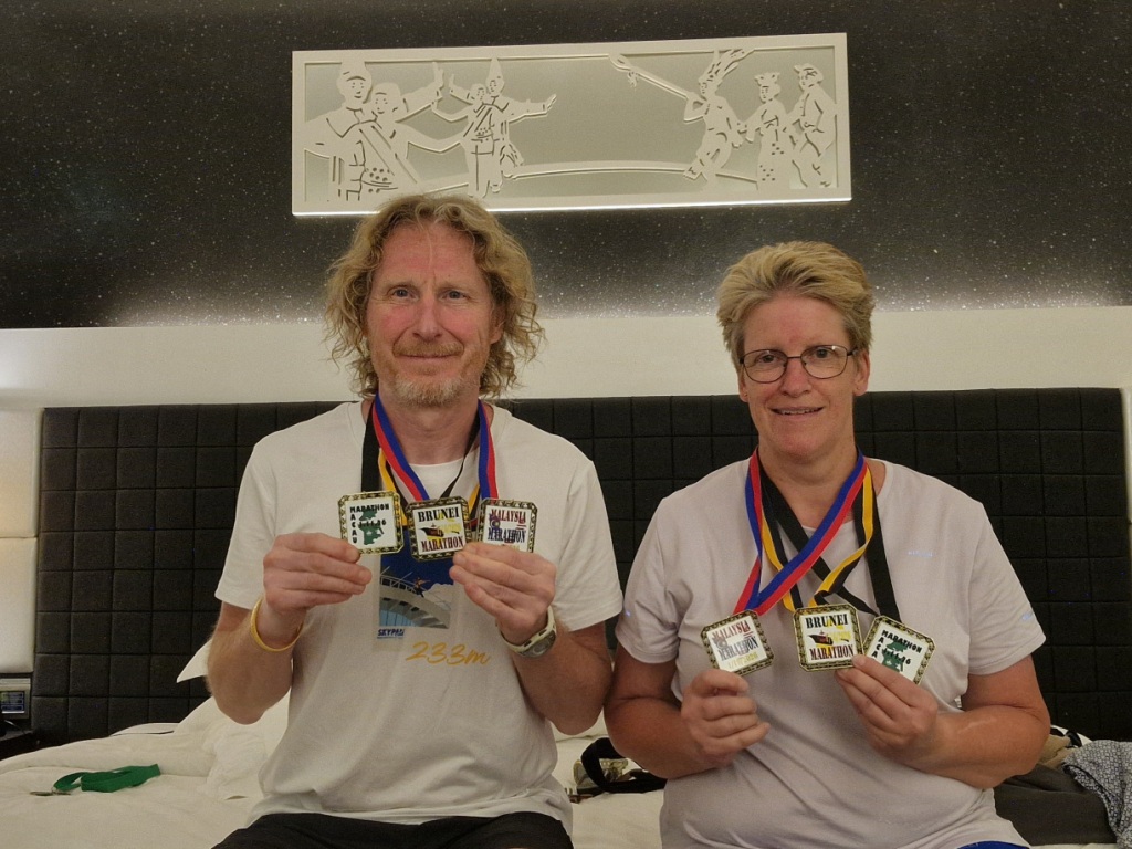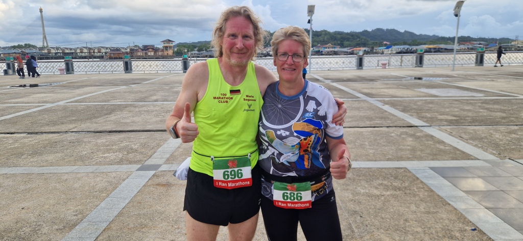 Nach dem Frühstück verabschieden wir uns von Thomas, der die Heimreise antritt. Wir fliegen nach einer Moscheebesichtigung weiter nach Kota Kinabalu, einer malaysischen Stadt, ebenfalls auf der Insel Borneo gelegen. Unser Hotel liegt direkt an der Uferstraße, gegenüber vom Veranstaltungshotel. Abendessen gabs beim großen M. Am nächsten Morgen besichtigten wir die Promenade und trafen unsere Mitläufer zum Startbriefing. Danach ging’s direkt auf die Laufstrecke und wir absolvierten die erste Runde gemeinsam zur Streckenbesichtigung. Da der Rückweg nun bekannt war, liefen jetzt alle ihr eigenes Tempo. In der Hotellobby stand wieder die Eigenverpflegung und der Ehemann einer Mitläuferin zählte die Runden. Der angekündigte Dauerregen blieb zum Glück aus, aber es war recht warm und schwül. Auch hier waren wieder viele einheimische Läufer auf der Strecke unterwegs, die oft freundlich grüßten, manchmal sogar fragten, was wir denn hier laufen. Durch große Kantensteine waren Fuß- und Radweg bestens von der Fahrbahn der Autos getrennt, so dass wir weder mit fahrenden noch parkenden Kraftfahrzeugen zu tun hatten. Über uns flogen zig Flugzeuge, die im Landeanflug auf den städtischen Flughafen waren. In der letzten Runde setzte ich dann die Stirnlampe auf, um nicht noch auf den letzten Kilometern auf Blättern oder anderen Hindernissen auszurutschen. Nach meinem Finish ging ich in unser Hotel und zog mir trockene Sportsachen an. Anschließend kaufte ich kalte Getränke, damit Doris auch auf ihren letzten Runden noch ausreichend Erfrischungen hatte. Sie lief die gesamte Strecke mit einer US-Vietnamesin. Ich saß derweil in der Lobby und erklärte ihrem Ehemann, wie der Countrymarathonclub funktioniert und wie man sich dort anmeldet.