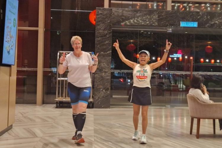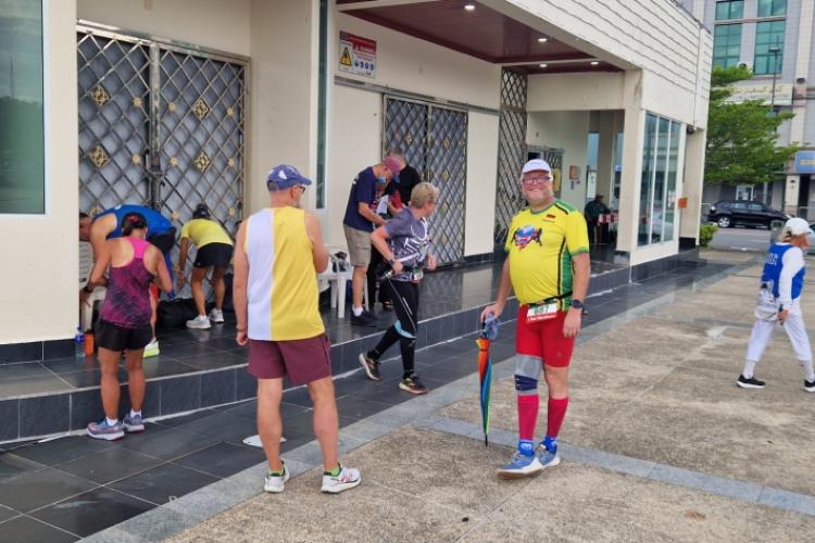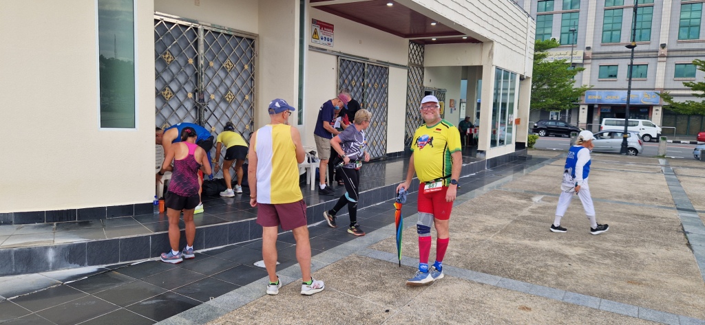 Dafür lief es bei der Ankunft in Hong Kong reibungslos, denn wir fanden einen Minibus, der uns über die 52 Kilometer lange Brücke nach Macau brachte. So brauchten wir nur noch ein Taxi zum Hotel in Macau, das an einer Bucht am Südchinesischen Meer liegt. Das Hotel war prima und wir erholten uns von der Reise. Beim Frühstück am nächsten Morgen trafen wir den Finnen Peter und Anton aus Österreich, beides Ländersammler wie wir, die für die nächsten Tage unsere Reisekollegen sein würden. Gemeinsam fuhren wir zur Startbesprechung ins Stadtzentrum, denn der Lauf sollte im Casino-Viertel stattfinden. Dort gab es herzliche Begrüßungen mit den bekannten Läufern (aus USA; Iran und Dänemark) und neue Freundschaften wurden geschlossen. Nach der Besprechung kauften wir unsere Getränke für den Lauf ein, der am späten Abend starten sollte. Im Hotel warteten wir auf Thomas und nach seiner Ankunft gings per Taxi zum Start. Wir stellten unsere Flaschen in der Hotellobby ab, wo die Freundin vom dänischen Lauffreund Klaus darüber wachte und die Runden zählte. Gemeinsam marschierten wir durch das nächtliche Macau. Anfangs trafen wir noch Konzertbesucher, die aus einer Arena zu den Bussen und UBER-Taxis strömten. Später waren nur noch unsere Mitläufer und ein paar streunende Hunde unterwegs. Zwischendurch hörte ich per Internet-Radio noch die Endphase vom HSV-Spiel, denn in Deutschland war es erst nachmittags. Da überall Kameras hingen, bevorzugten wir die Hotel-WCs, um kein öffentliches Ärgernis zu erregen. Außerdem begeisterte fließend Wasser, Seifenspender und Papierhandtücher, den erprobten Teilnehmer an DIY-Marathons. Als wir nach 21 Runden fertig waren, bekamen wir von der Veranstalterin unsere Medaillen und fuhren frühmorgens – und ziemlich übernächtigt - zurück ins Hotel. Wir konnten ausschlafen, während Thomas und die anderen bereits auf dem Sprung zur Weiterreise nach Taiwan waren. Abends aßen wir in einem Strandrestaurant Hummer und packten dann unsere Koffer, weil wir am nächsten Tag nach Brunei fliegen sollten. Den Kontakt zur Heimat, denn dort sollte ja laut Wettervorhersage eine Schneekatastrophe über Schleswig-Holstein einbrechen, hielten wir per Außenkamera (Schneelage!), Whatsapp, Schleswig-Holstein-Magazin in der ARD-Mediathek und der Online-Ausgabe des Hamburger Abendblatts. Die Weiterreise startete mit dem Hotelshuttlebus zum Ausreiseterminal in Macau und von dort mit dem Flughafenbus nach Hong Kong Flughafen. Von dem Fahrpreis bekamen wir in Hong Kong sogar noch 2/3 zurückgezahlt, weil es sich um eine erstattbare Flughafengebühr handelt. Wir stellten erfreut fest, dass sich die Strapazen und der Stress, um von Hong Kong nach Macau und zurück zu kommen, seit unserer Reise im März 2024 gewaltig reduziert hatten.