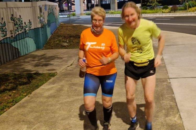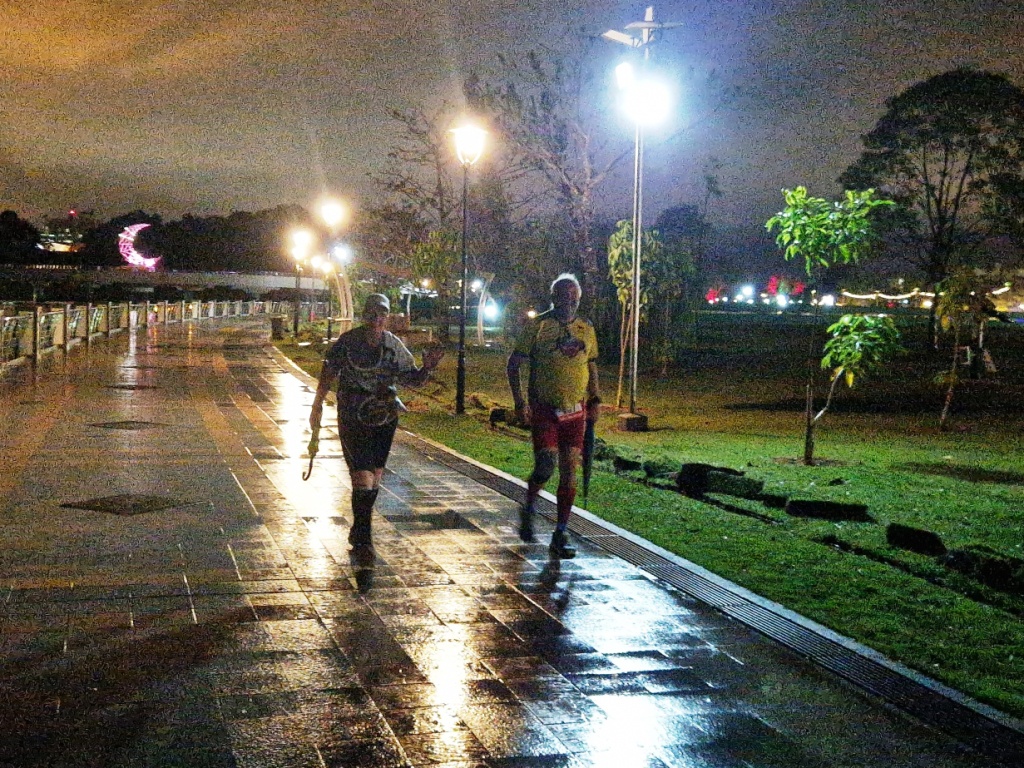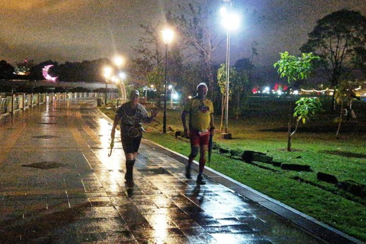 Am nächsten Tag besichtigten wir die Stadt bei Tageslicht , fuhren mit dem Boot durch die Wasserstadt und trauten uns sogar über einen Holzsteg zu einem Spaziergang dorthin. Der war ehrlichweise aber frisch renoviert und die Holzbalken machten einen äußerst vertrauenswürdigen Eindruck. Als wir die alten Balken erreichten, machten wir Fotos und traten vorsichtshalber den Rückweg an. Zurück auf festem Boden sahen wir an der Uferpromenade einige Läufer: es sollte die Strecke sein, auf der wir am Folgetag ebenfalls unterwegs sein würden. Abends reisten die Laufkollegen aus Taiwan an, so dass wir mit Thomas abends Essen gingen. Es regnete mehrfach, teilweise sogar Starkregen, so dass wir uns Regenschirme kauften. Am nächsten Tag fand nachmittags die Startbesprechung statt und wir gingen gemeinsam zum Start, ausgestattet mit Getränken und eben den genannten Regenschirmen. Die Strecke führte an der kompletten Promenade entlang. Die erste Runde liefen wir in der Abendsonne, die zweite dann im Starkregen, zum Glück ohne Gewitter. Das Wasser stand auf den Gehwegplatten, so dass es manchmal sehr rutschig wurde. Als der Regen aufhörte kamen die lokalen Läufer und drehten ihre Trainingskilometer. Auch liefen wir an einem Parkplatz entlang, auf dem die Bewohner der Wasserstadt ihre PKWs abstellen, wenn sie mit dem Boot in ihre Häuser fahren. Nach sechs Runden und mit einem weiteren Regenschauer war ich fertig und ging ins Hotel. Doris hatte noch etwas länger zu laufen und spulte die letzten Kilometer gemeinsam mit Thomas ab, teilweise durch die Schirme gegen den Regen geschützt.