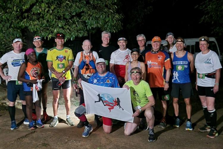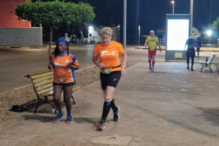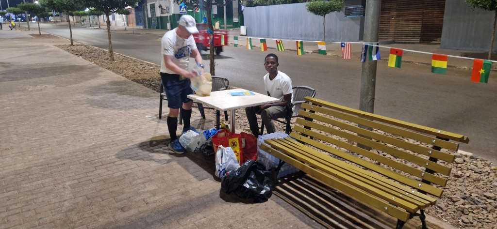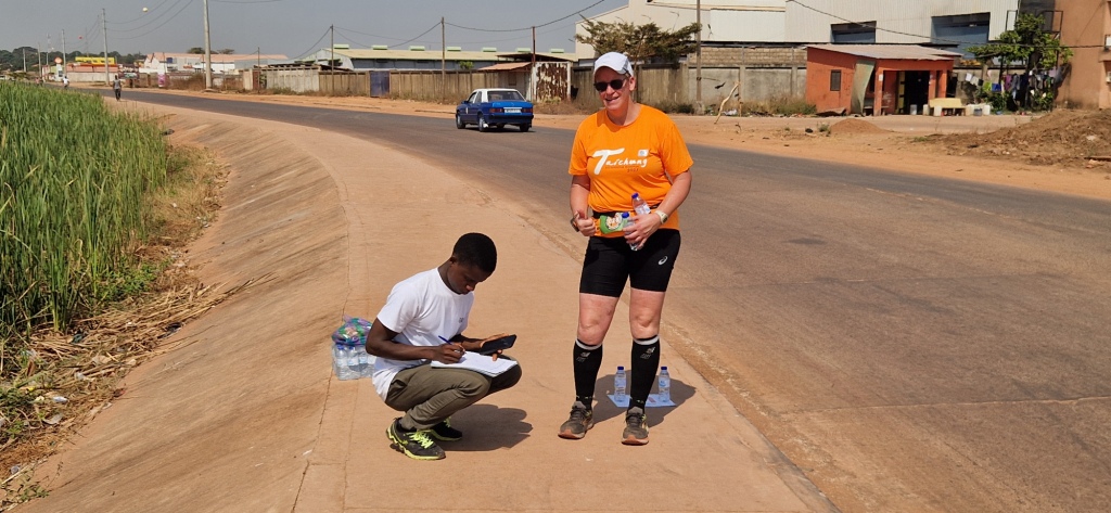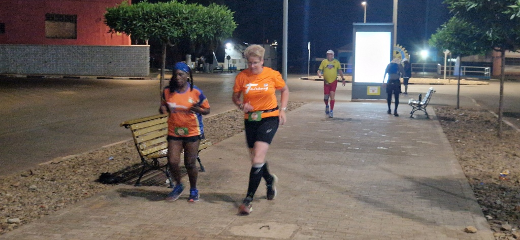 Perfekt durch Dayo vorbereitet, bekamen wir schon um 4 Uhr Hotelfrühstück. Danach stellten wir unsere Verpflegung und Kleidertaschen (mit Stirnlampen, Sonnenbrillen, Laufkappen, etc) auf den Tisch auf den breiten Promenadenbürgersteig (gepflastert!) direkt vor dem Hoteleingang ab. Dann liefen wir 20 Meter zum Heldenplatz, an dem wir nach den obligatorischen Fotos starten. Zuerst liefen wir 6 Runden am Hotel auf und ab und danach – als die Dämmerung langsam einsetzte – in Richtung Industriehafen. Ebenfalls 6 Runden als Begegnungsstrecke. Dadurch sah man die Mitläufer und konnten sich gegenseitig motivieren, denn zum späten Vormittag kratzte das Thermometer bereits an der 30°C-Marke. Und da waren noch lange nicht alle fertig. Dayo hatte die Streckenposten sehr gut eingewiesen, denn an allen relevanten Abzweigern stand jemand und zeigte den Weg an. Außerdem waren die Verpflegungsstände bis zum Ende besetzt und es wurden Wasser und Bananen gereicht.