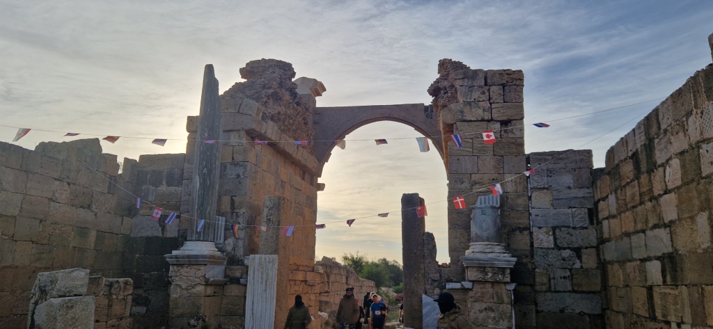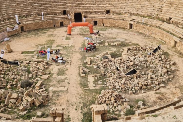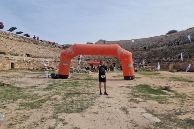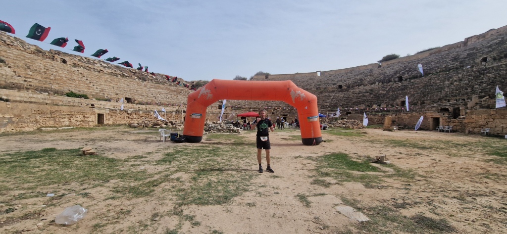 Wir starteten auf einer alten römischen Handelsstraße und nach ca. 2 Kilometern erreichten wir eine Teerstraße, auf der wir 13 Runden gegen den Uhrzeigersinn laufen würden, die sich später in eine festgefahrene Sandstraße änderte und zum Ende durch eine Sanddüne mit Anstieg wieder auf die Teerstraße führte. Am Ende der Runde saßen die Rundenzähler, es gab Wasser, später auch Cola und Obst. Dort war der Rettungsdienst postiert und die Toilettenhäuschen. An jedem wichtigen Abzweiger stand ein Streckenposten und es gab noch 3 weitere Wasserstationen. Die Strecke war bis auf Fahrzeuge vom Veranstalter verkehrsfrei. Optimal. Die Temperaturen lagen zu Beginn bei 20 Grad und es gab eine angenehme Brise vom Meer. Diese Brise wurde im Laufe des Rennens stärker und trieb an der Düne manchmal sogar Sandwolken vor sich her. An den ungeschützten Passagen machte der Wind mir das „Läuferleben“ einige Male ganz schön schwer. Durch die Rundenlänge von etwas über 3 Kilometern hatte ich immer wieder Gelegenheit zu überrundeten Teilnehmern aufzuschließen und wurde selbst nur 3mal überholt und konnte eine zeitlang an der ersten Frau dranbleiben. Heute wollte ich ein wenig Gas geben und dem einen oder anderen zeigen, was der „alte Mann“ noch so drauf hat, vor allem, weil beim letzten Lauf einige Teilnehmer deutlich vor mir aufhörten zu laufen. Schließlich wurde ich hinter den üblichen Verdächtigen und der ersten Frau Gesamtfünfter in 4:25 Stunden. Der Zieleinlauf war in der römischen Arena am Meer gelegen und hatte Einmaligkeitsstatus. Nachdem ich mich erholt und der Pakistani Ziyad mir die Medaille überreicht hatte, ging ich die 300m zurück zur Laufrunde, um meinen Kleiderbeutel abzuholen. Damit zurück ins Stadion, umziehen und essen und trinken. Dann ging's auf Fototour in und um die Arena - fantastische Eindrücke. Mein erster Gedanke: in Griechenland oder Italien wäre der gesamte Bereich abgesperrt, man müsste Eintritt bezahlen und zig Studenten würden auf dem Boden rumkrabbeln und mit kleinen Pinseln, Bürsten und Schaufeln bewaffnet die Steine freilegen, messen und katalogisieren. Hier sah es dagegen so aus, als hätte eine Abrissbirne gewütet und die Reste warteten auf die Abholung durch eine Entsorgungsfirma.