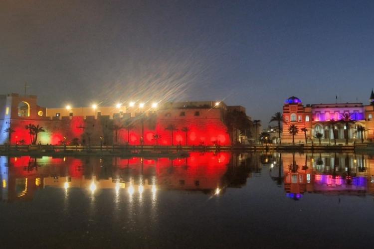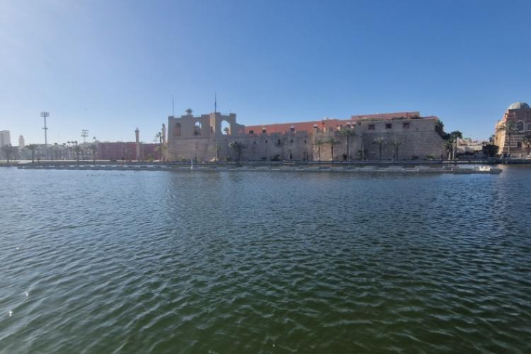 Nach der Landung kostete uns die Immigration 2 Stunden Wartezeit, trotz Unterstützung des lokalen Reiseleiters. Endlich im offenen Teil des Flughafens angekommen, wechselten wir viel zu viel Geld und kauften spottbillige SIM-Karten. Dann kamen die Begleiter der Tourismuspolizei dazu und wir fuhren in Kleinbussen gen Osten, aber nur einige Kilometer, um in einem kantinenartigen Restaurant Mittag zu essen. Sehr lecker und - was selten vorkommt - die Vegetarier durften als Erste ans Buffet. Nach dem sehr leckeren Essen ging’s weiter in Richtung Leptis Magna, einer alten römischen Stadt. Wir bezogen ein Ferienressort, dass sich problemlos mit 5-Sterne-Ferienanlagen auf Mallorca oder anderen europäischen Urlaubsregionen messen konnte. Durch den Ausfall von Doris war nicht geklärt, ob ich im Doppelzimmer bleiben könnte, ein Einzelzimmer bekäme oder einen Zimmerpartner. Ich bekam einen Zimmerschlüssel für mich allein, öffnete die Tür und bekam den Mund nicht wieder zu: 3 Schlafzimmer, 2 Badezimmer, 1 Wohnzimmer, 1 Esszimmer mit Küchenzeile, 1 Balkon und eine eigene innenliegende Terrasse mit kleinem Pool - nur für mich. Die anderen wohnten genauso exklusiv. Nach einem kurzen Besuch am Strand war Abendessen, im gleichem Niveau, nicht arabisch oder afrikanisch. Anschließend war das Briefing für den Lauf am nächsten Morgen, Vorstellung der örtlichen Reiseleiter und den sportlich Verantwortlichen (aus dem Sportministerium). Laut örtlichem Reiseleiter sind wir die größte Reisegruppe im Land seit der Revolution 2011. Jetzt konnten sich die Läufer intensiver austauschen - nicht nur mit dem Sitznachbarn im Flieger, Kleinbus oder Restaurant. Trotzdem freute ich mich aufs Bett nach der nicht ganz so erholsamen Nacht auf dem Istanbuler Flughafen.