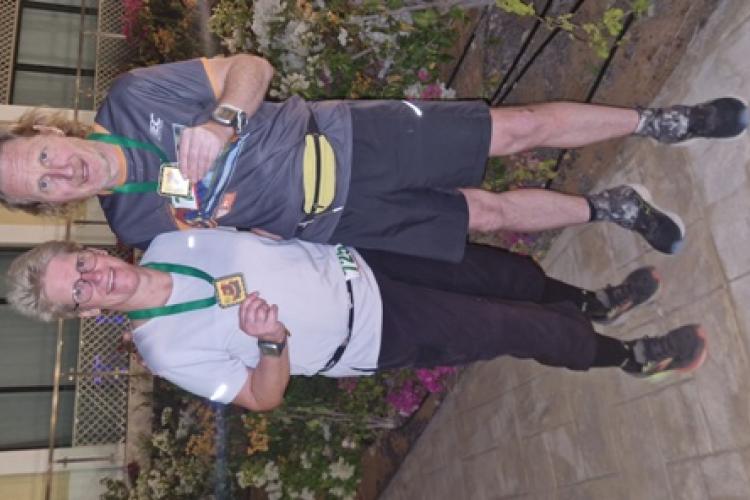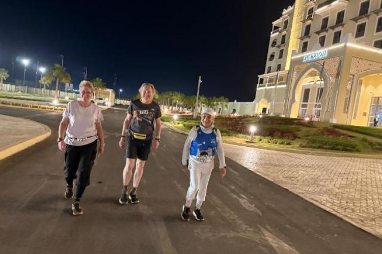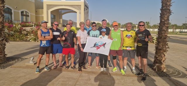So starteten wir um 18 Uhr abends und marschierten mit 9 weiteren Teilnehmern vom Abend in die Nacht. Da uns das Sheraton freundlicherweise unterstützte und das Gelände zur Verfügung stellte, war die Strecke gut beleuchtet, mit sehr guter asphaltierter Oberfläche und wir konnten sogar die Toiletten in der Lobby oder im Pool-Bereich nutzen. Durch unser langsameres Tempo kam es zu einigen Überrundungen, die sich mit der Zeit reduzierten. Beim Überholen wurde immer wieder kurz geschnackt, so dass es trotz der Dauer ein kurzweiliger Lauf bei sommerlichen Abendtemperaturen war.