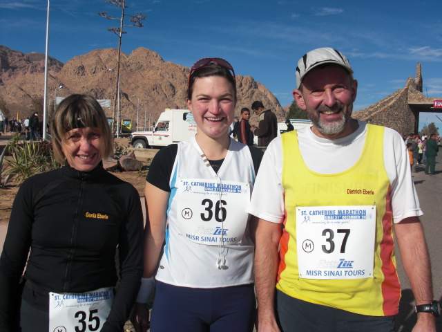 Erster wurde der Vorjahressieger Mark Werner aus den USA, der eine Statistik-Professur an der Universität Kairo hat. Erste Frau wurde Christine Feger aus Hannover mit einer Zeit von 3:58. Einen beachtlichen 2. Platz erlief Gunla Eberle. Dietrich Eberle wurde 1. der 100MC‘ler, da Jürgen Kuhlmey wegen seines noch nicht verheilten Fersensporn sich mit einer 5 km Wanderung zusammmen mit seiner Frau Ingrid zufrieden geben musste. Bei der anschliessenden Siegerehrung bekamen wir neben Medaillen eine stilechte Papyrus-Urkunde. Sylvester feierten wir dann entspannt und etwas „zu“ laut im Hotelrestaurant mit arabischen Vorführungen(Akrobatik, Bauchtanzvorführungen). Zum nächsten Morgen, d.h. am 1.1.09 hatte uns Pater Constantin zu einer beeindruckenden persönlichen Führung in das welthistorische St. Katarien-Kloster eingeladen. Am 3. Januar ging es dann wieder zurück, wobei für Gunla und Dietrich schon wieder ein 24-Lauf in Dänemark wartete.