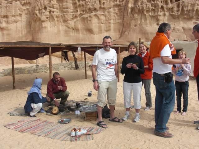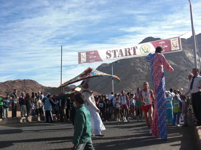 Auf dem Flugplatz Berlin-Schönefeld traute ich meinen Augen kaum. Da lief doch Dietrich Eberle durch die Abflughalle - seine Frau Gundula war dann auch nicht weit. Auch er hatte den Sylvester-Marathon zum Ziel. Zunächst ging es mit dem Flieger von Berlin über Kairo nach Sharm el Sheik und weiter mit dem Bus nach Nuweiba am Golf von Akaba, allerdings mit der Ankunft erst um 2 Uhr in der Frühe. Nach einem Ausflug nach Dahab mit Bootstour, Schnorcheln und einem feudalen arabischen Essen in einem Beduinenzelt bei Abendrot, sowie einem Ausflug in ein Wadi-Tal mit steilen Abstiegen fuhren wir weiter nach dem in 1500 m Höhe liegenden St. Katarinen-Kloster mit Übernachtung in einem Wüstenhotel mit Steinbungalows im Berberstil. Hier sollte der St.Katharien-Friedens-Marathon in 1.500 m Höhe unter rauhen klimatischen Verhältnissen statt finden. Eine zünftige Vorbesprechung im dortigen Kulturzentrum mit Erläuterungen dieses einmaligen Marathons stimmte uns auf den Marathon ein. Horst Preisler hatte Grüsse und einen Bericht von seinem 600 km Friedenslauf von Nagasaki nach Hiroshima gesand und persönlichen Geschenken für alle ägyptischen Läufer beigelegt. Er versprach, möglichst im nächsten Jahr selber dabei zu sein. Am Sylvester-Morgen dann arabisch-pünktlich gegen 9 Uhr fiel der Startschuss. Es waren 4 Runden zu laufen, 2 kleine 5,0 km-Runden und 2 grosse 16,1 km Runden. Die Organisation war gut, nur das deutsche Begleit-Fahrrad hatte schon bald einen Platten. Durch die Höhe von 1500 m fiel das Laufen und besonders die Steigungen schwer.