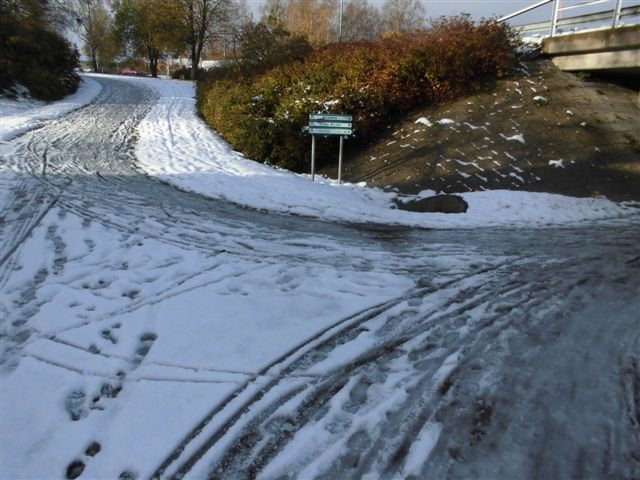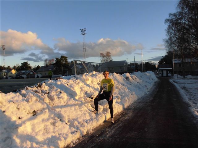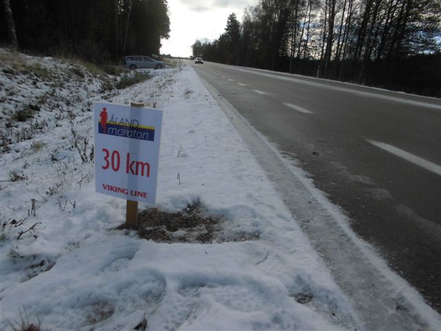 Jeder Kilometer war ausgeschildert. An dieser Stelle lief ich etwas langsam auf dem Schnee, da die Straße stellenweise doch recht rutschig war. Obwohl ich für den Rückweg 5 bis 6 Minuten länger als für den Hinweg benötigte, habe ich viele Plätze gutgemacht. Nur eine Läuferin wagte es, mich kurz vor km 31 zu überholen...4 km später ließ ich ihr aber keine Chance...dabei sollen die Skandinavier doch recht schnell sein (habe ich jedenfalls aus einem Bericht von Arne aus DK so in Erinnerung)...oder lag es an den PUMA-Schuhen, welche ich vor Jahren auf der Bremer Marathonmesse erwarb und in letzten Wochen im Paketlager ordentlich eingelaufen hatte?